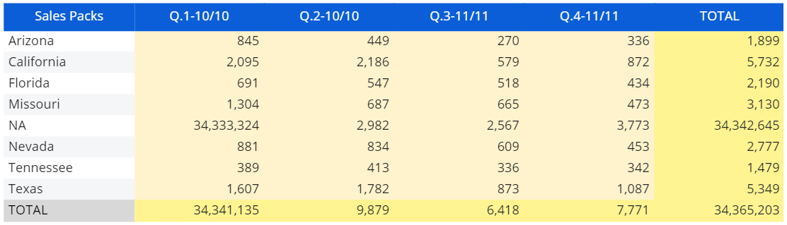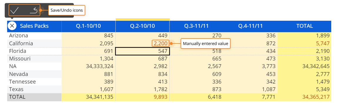 When data entry is enabled on a Cube, the background of totals cells turns yellow while the background of values cells turns ivory (unless otherwise formatted), as in the following example: