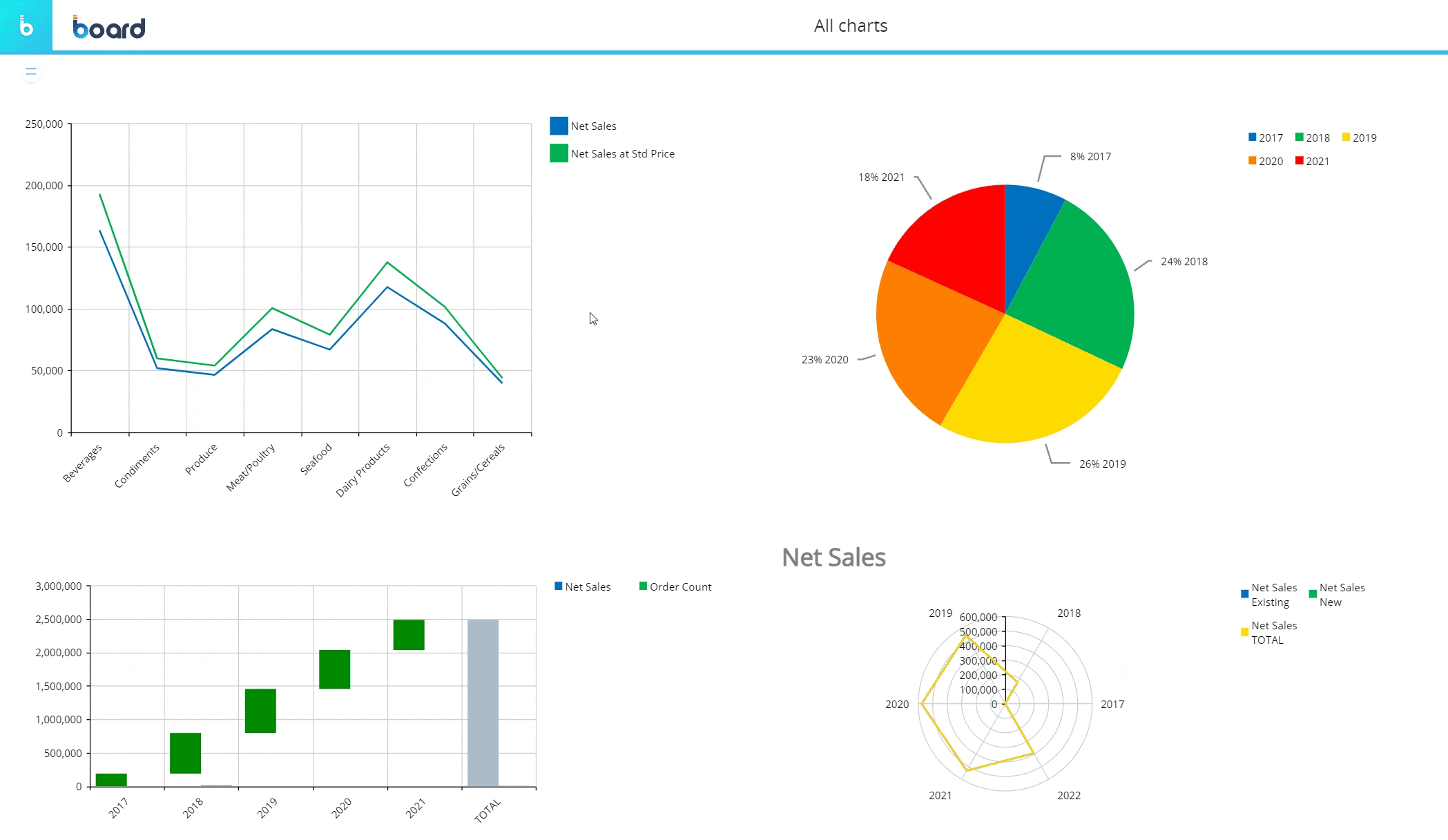 Actions mentioned above are available on Cartesian (except when the Funnel series type is configured) and Waterfall charts. The interactive selection feature is also available on the Bubble chart.