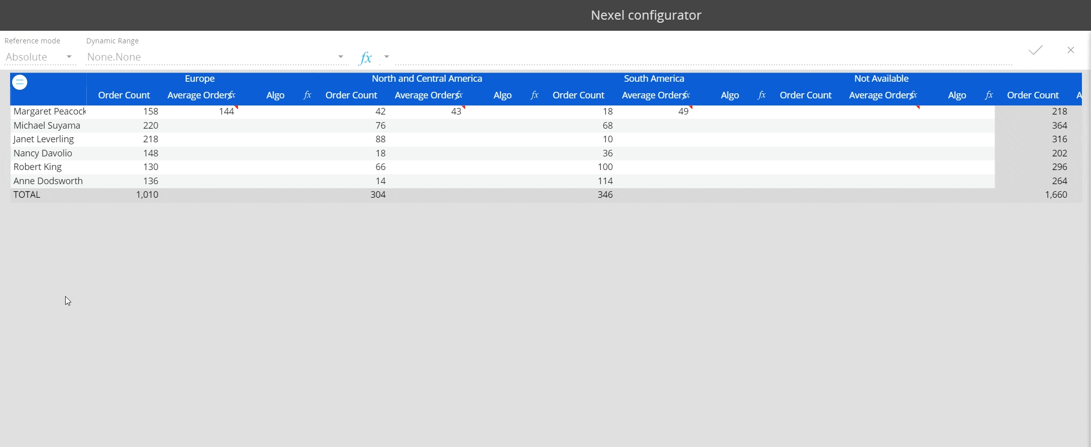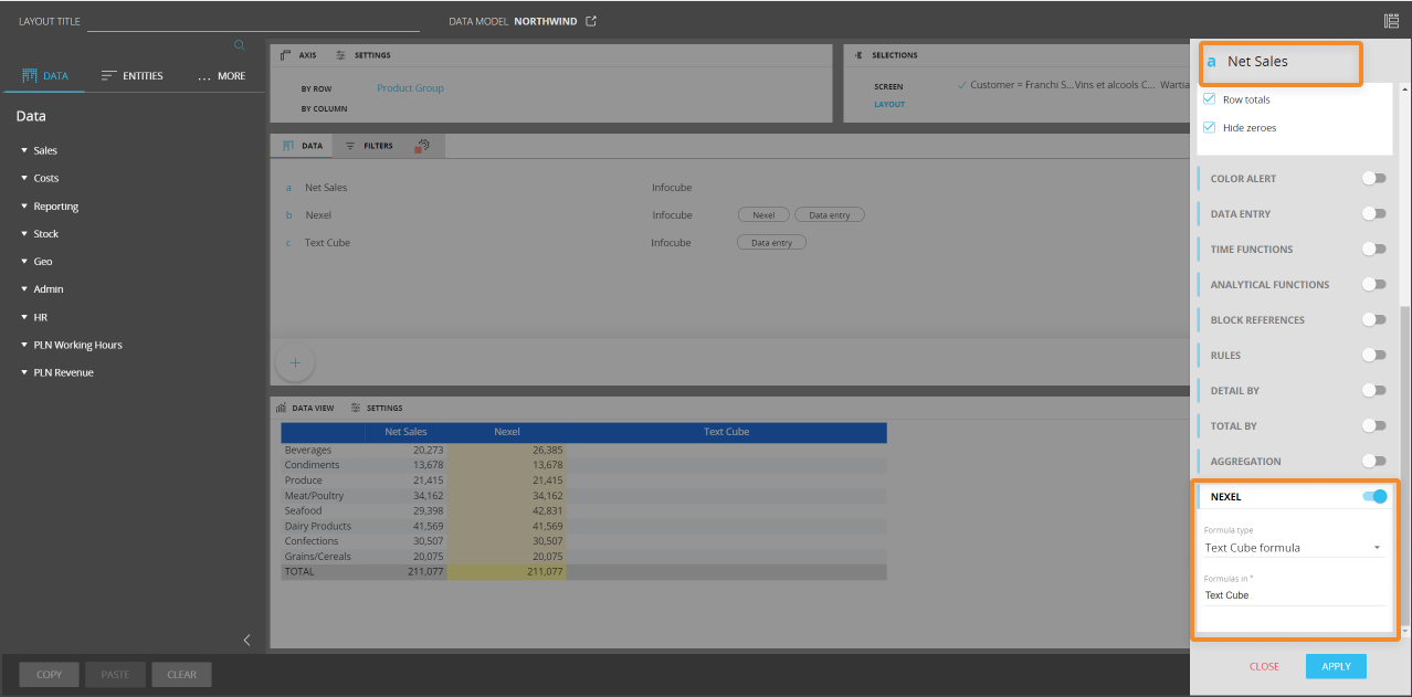 Nexel combines the flexibility and the versatility of a spreadsheet-like application with the power and robustness of a multidimensional object as the Data View. It offers a wide library of formulas embedded in the reporting layer to provide additional calculation capabilities on columns, ranges of cells and even single cells.