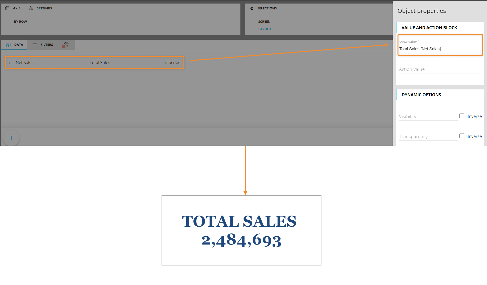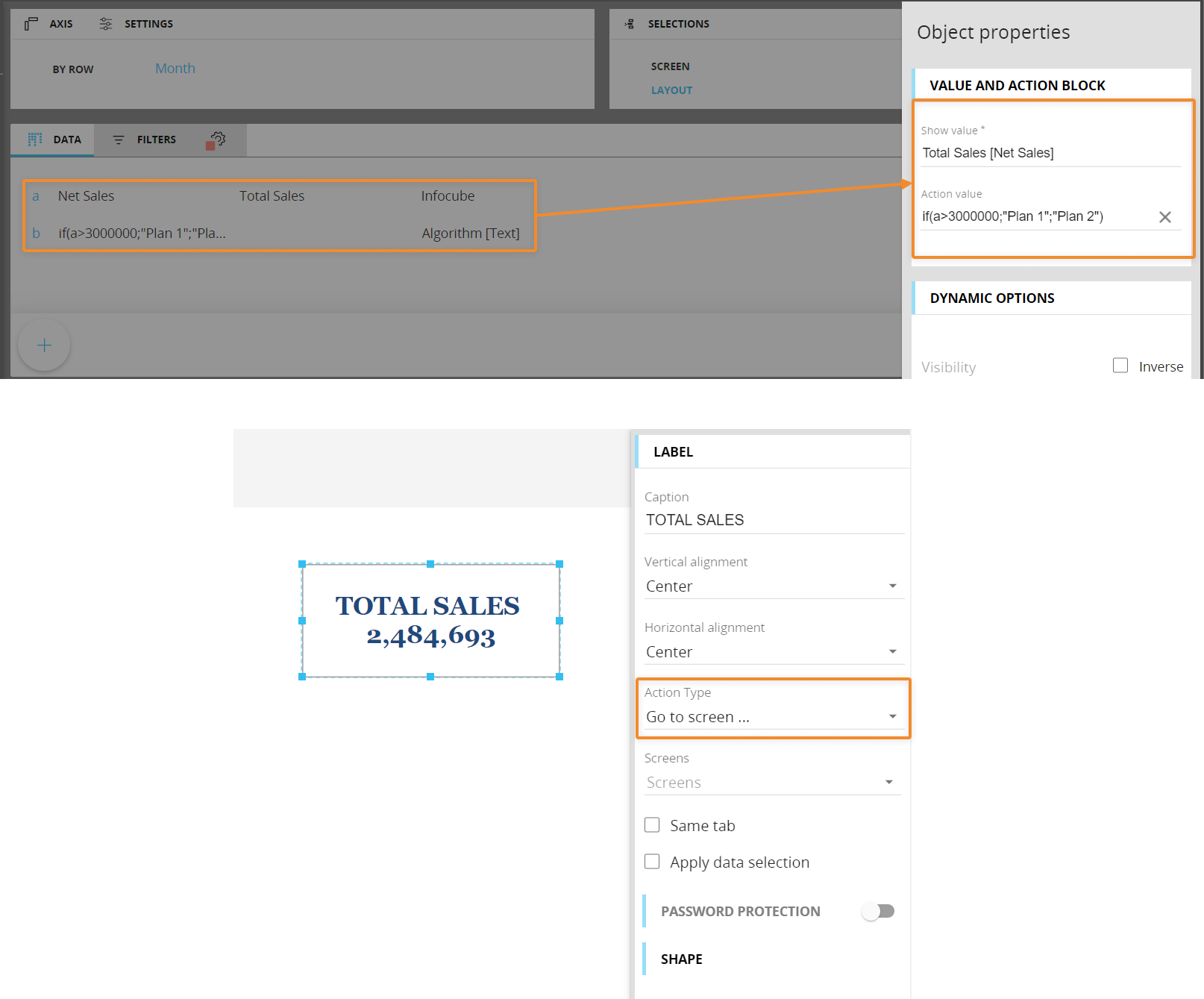 In the example below, if the Net Sales value is greater than 3 million, clicking the Label in Play mode will open the "Plan 1" Screen, otherwise it will open the "Plan 2" Screen.