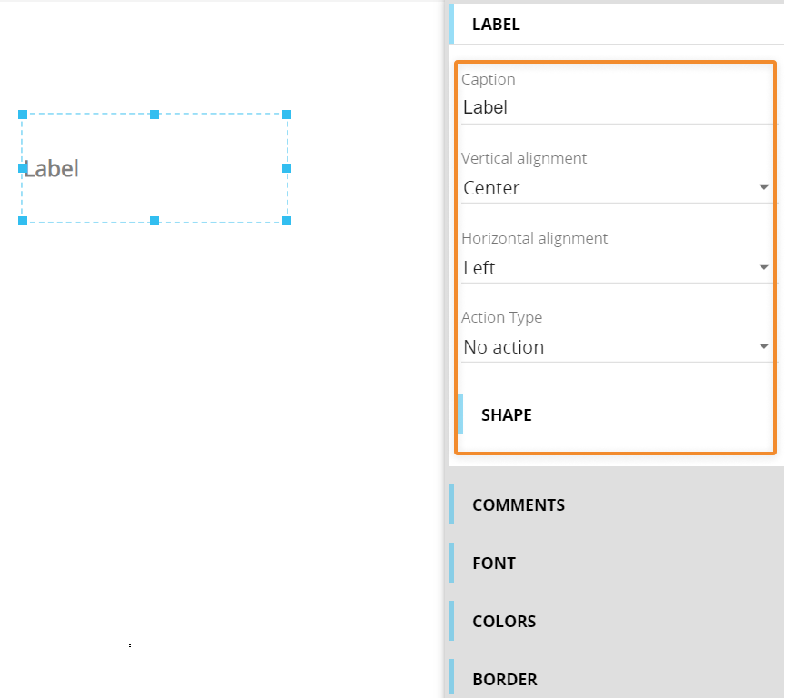 - In the Label properties panel, select one of the three supported actions mentioned above