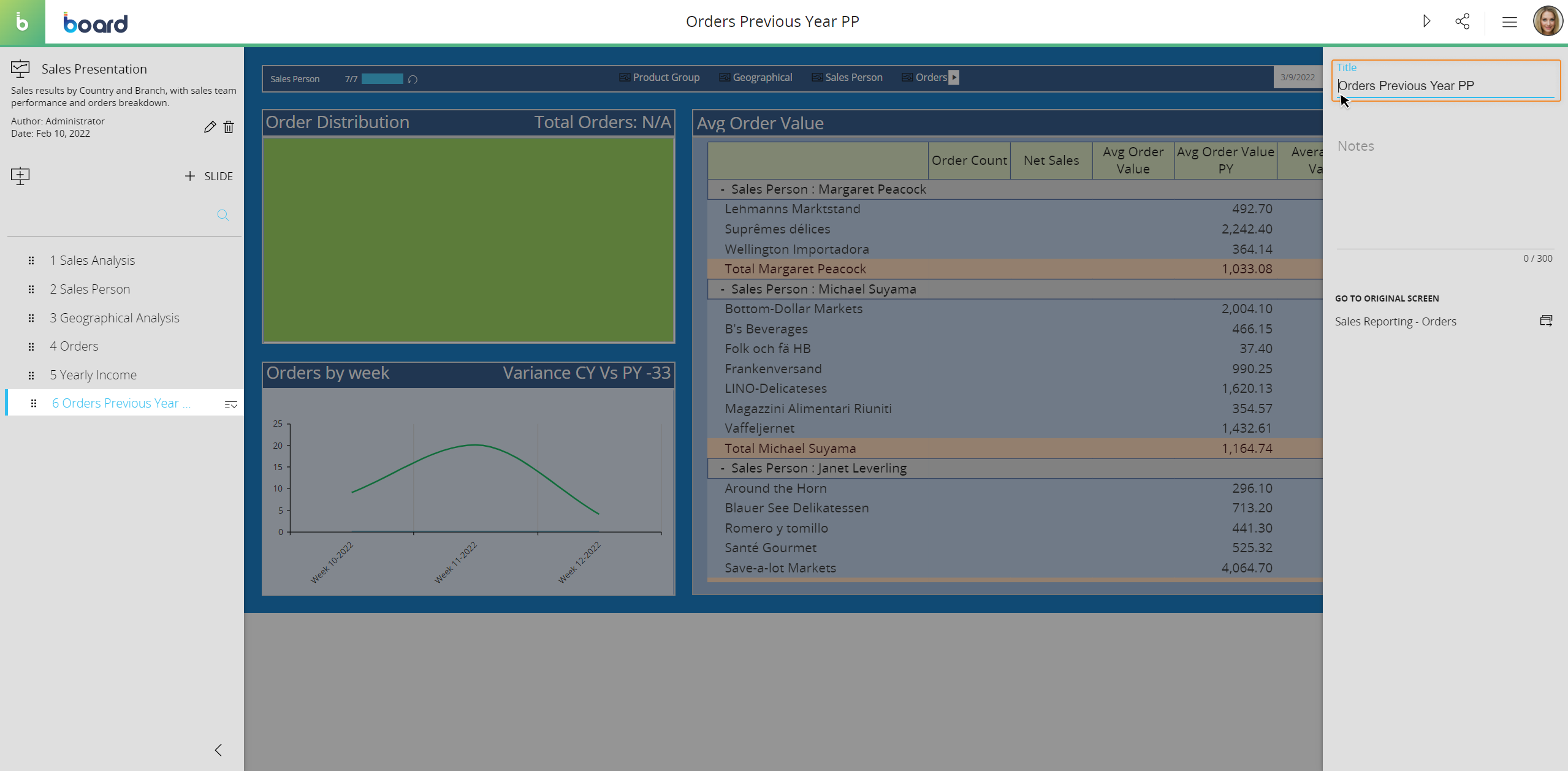 Once you've created a Slide and you've applied custom Layout definitions, Selections, drills and/or filters to the data in Edit mode, simply switch to Play mode to save the Slide. Leaving the Slide will also automatically save any unsaved settings.