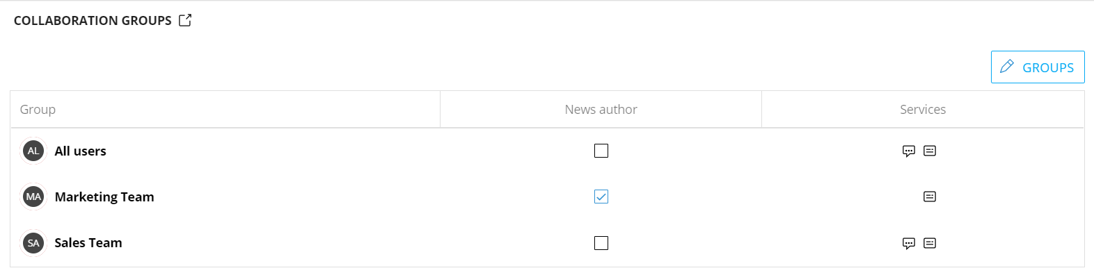 In the "Collaboration groups" table you can review all User groups the user is a member of. Checked checkboxes in the "Feed author" column indicate in which groups the user has been granted the "News author" role. Two icons at the end of the row indicate which Collaboration feature is enabled for each group (Feed and/or Chat).