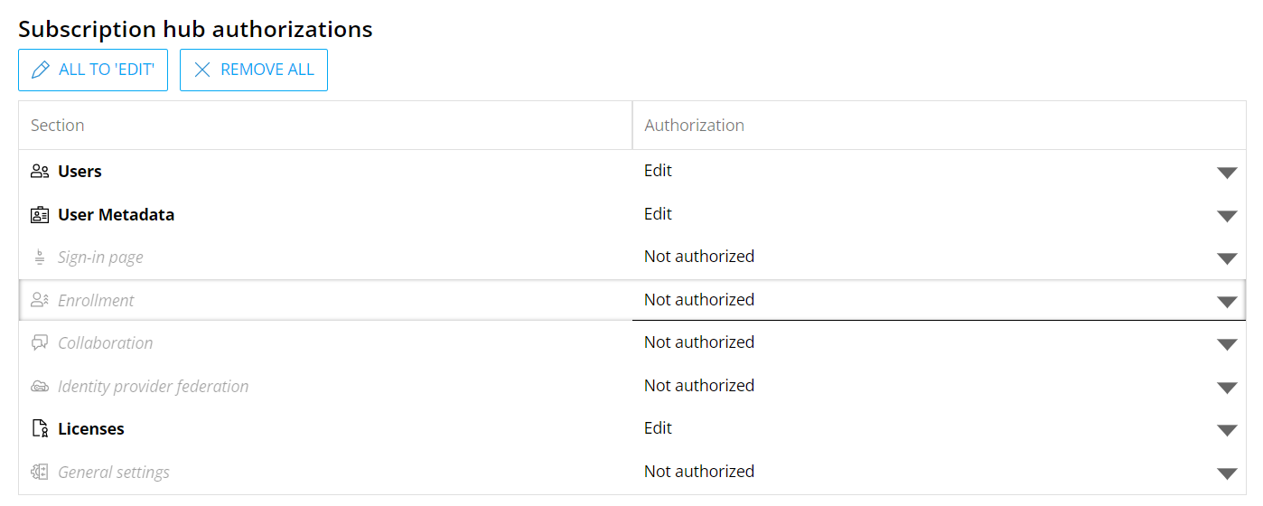 To edit authorizations, click the downward-facing arrow at the end of each row and select the desired setting.