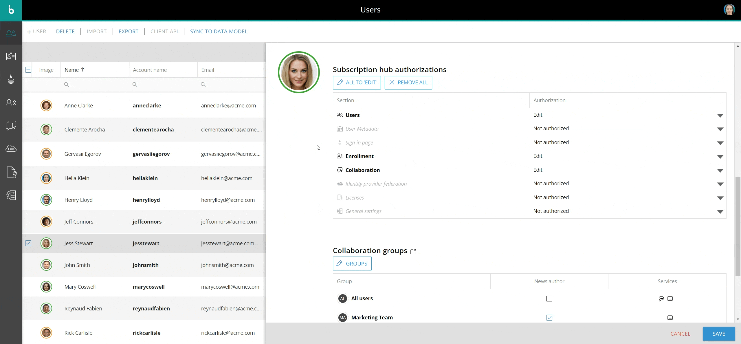 In the "Subscription Hub authorizations" table, you can manage authorization levels for each Administrator: you can grant or deny access to specific sections of the Subscription Hub to other Administrators, thus enforcing a deeper level of security and access control.