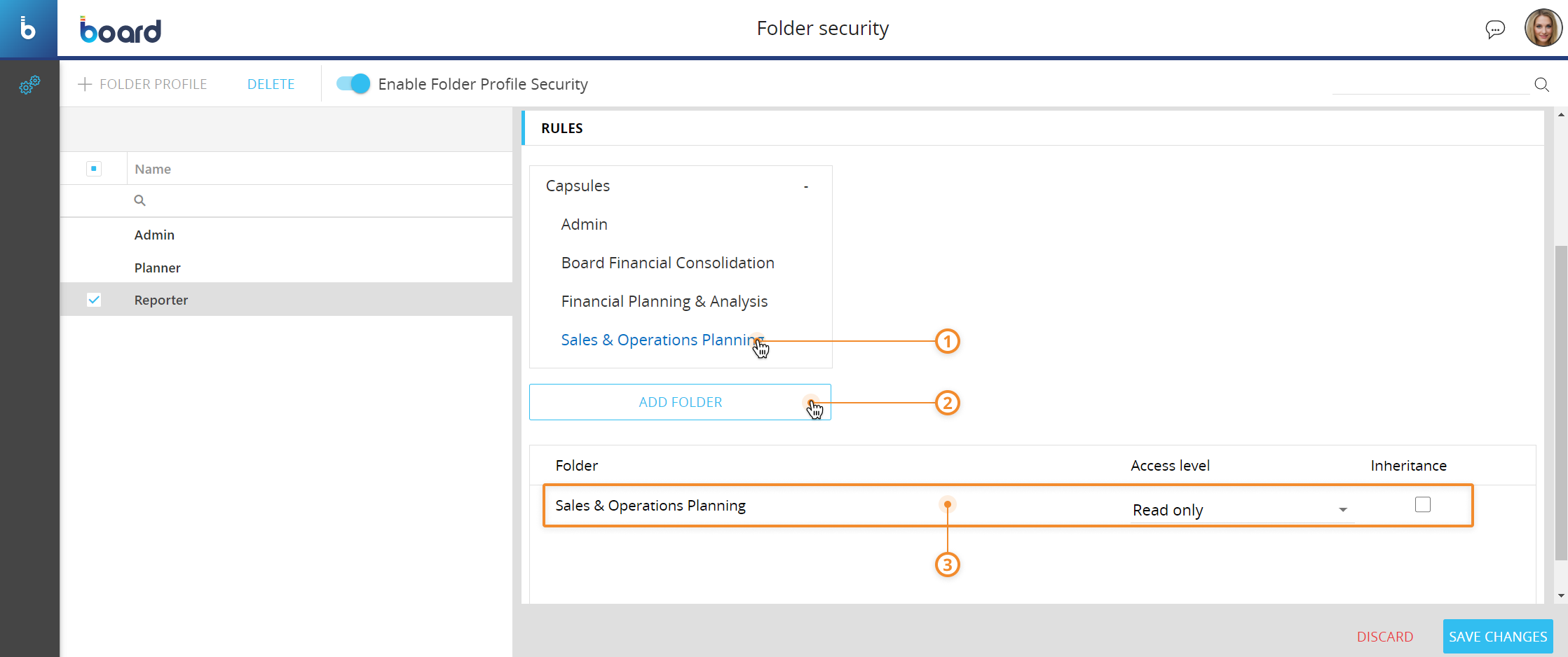 By default, users of a Board Platform can access all the Capsule folders on that Platform. However, there are cases where a company may have different applications made of various Capsules on the same Platform, such as a financial planning application and a sales operations application. In addition, there may be administration Capsules for both applications as well. Therefore, access to these Capsules should be controlled according to the role of each user, especially for administrative roles. In this scenario, you can place the Capsules of the various applications inside different Capsule folders, and then create Folder security profiles to allow users access only to certain Capsule folders. Finally, assign these Folder security profiles to the desired user Roles in the Roles section to grant users associated with those Roles access to different Capsule folders.
