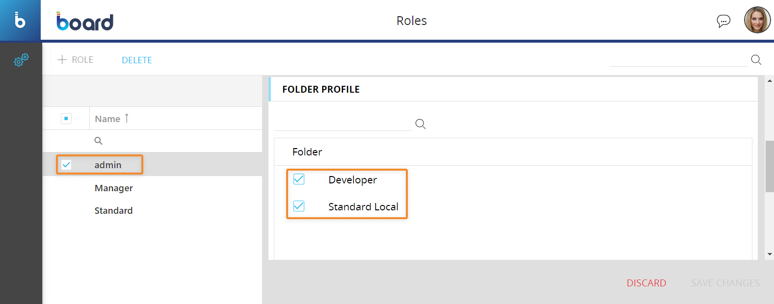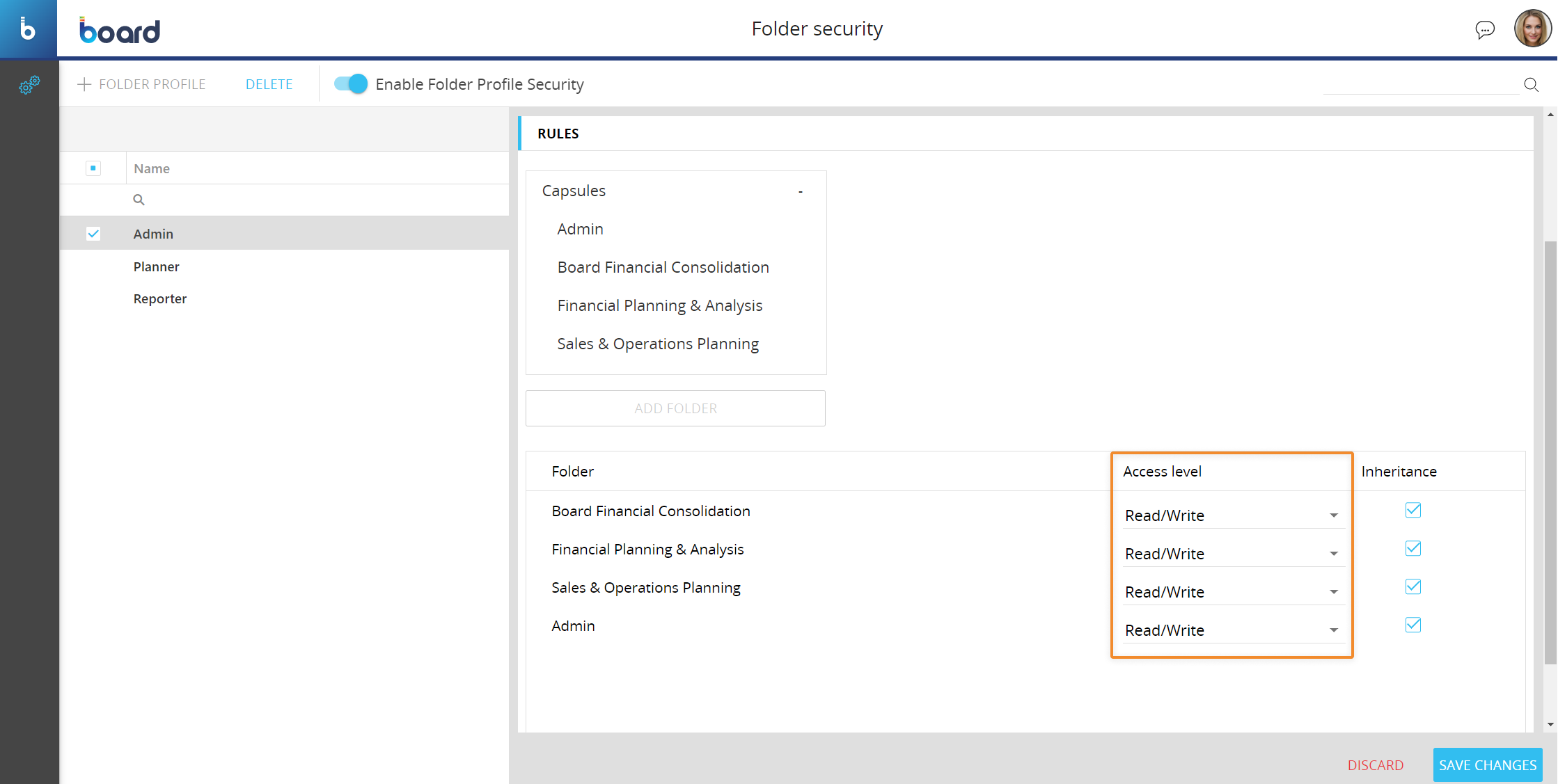 Therefore, in the case of the users associated with the "Admin" role, Board applies all security rules in both Folder security profiles, and in the case where security rules overlap, those with the highest access level take precedence over the others.
