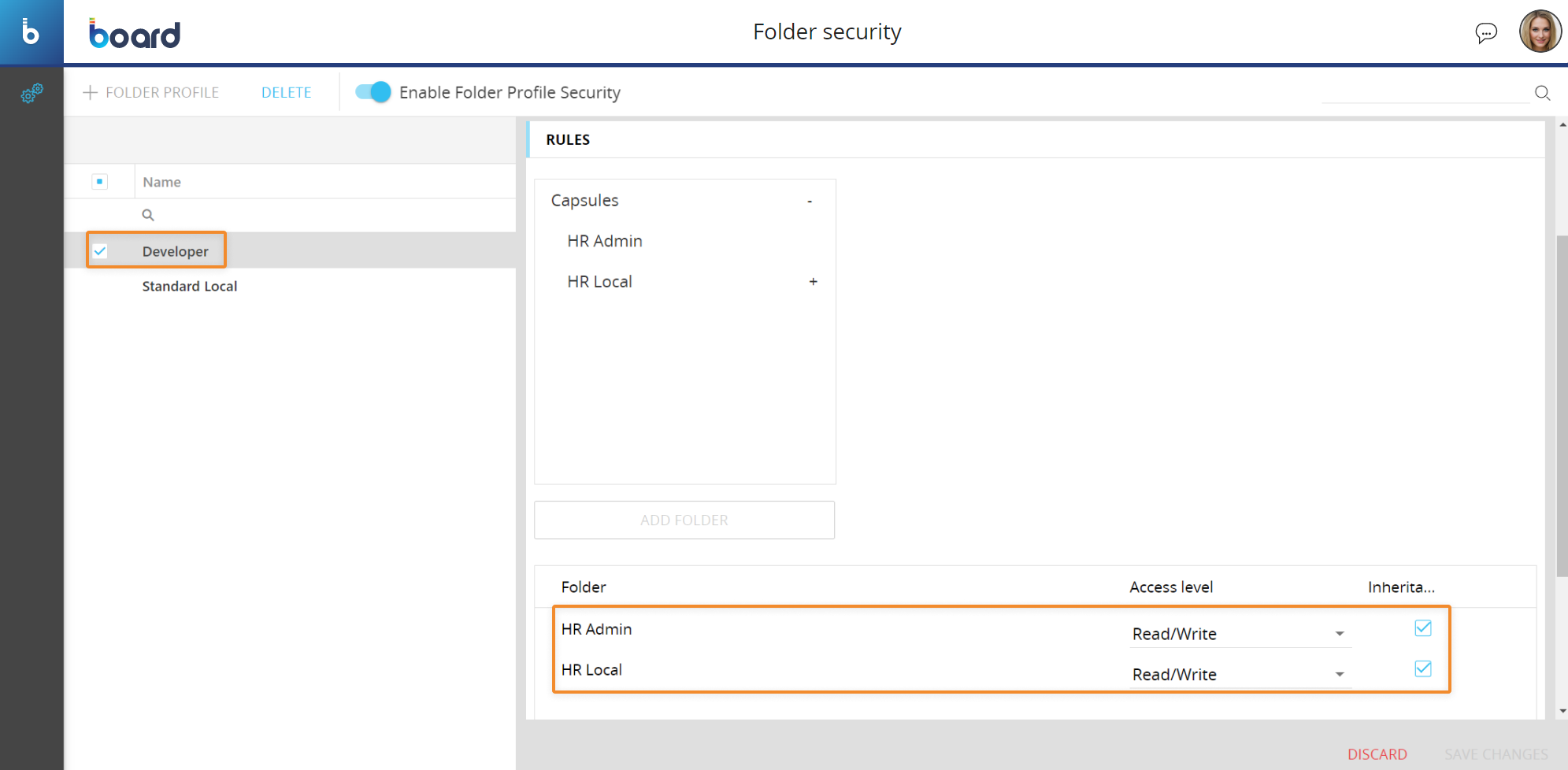 - Developer. This Folder security profile can access both the "HR Admin" and "HR Local" Capsule folders with the "Read/Write" access level. In addition, you can enable the "Inheritance" option on both security rules, which gives the user "Read/Write" access to all the subfolders of the two Capsule folders