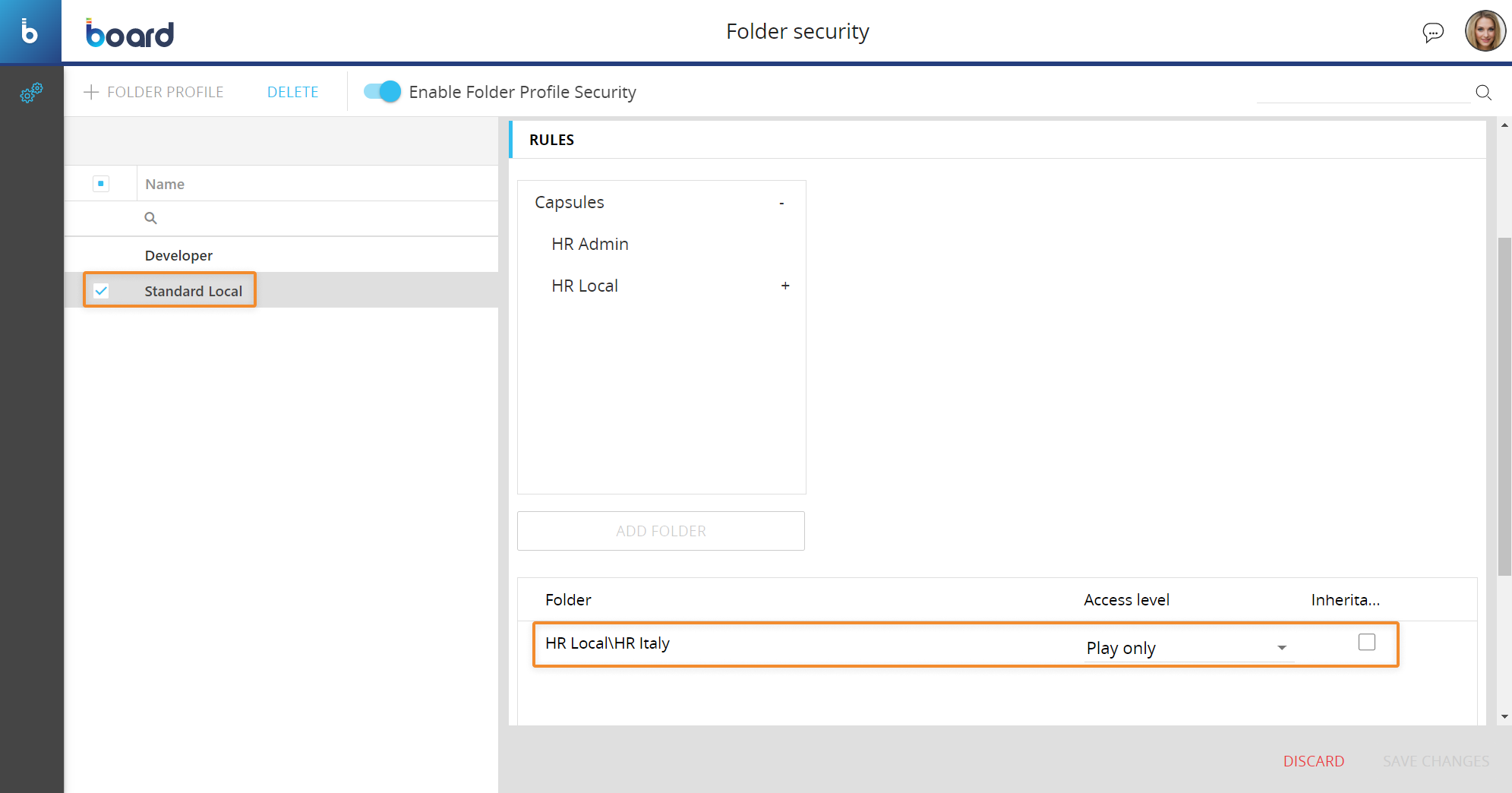 - Standard Local. This Folder security profile can only access a specific subfolder of the "HR Local" Capsule folder named "HR Italy" with the "Play only" access level.