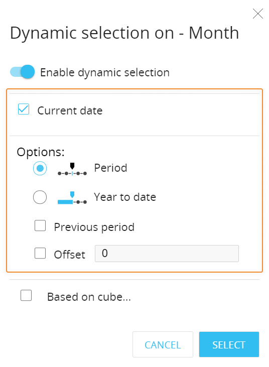 For example, if you're configuring the selection on the Month Entity based on a Cube whose latest data pertain to July 2021, the June-2021 member will be selected. - Offset. Shifts the selection by "n" periods, where "n" is an integer number.
