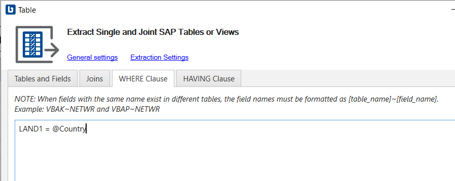 The parameter must have already been configured in the SAP Connector Query Design Panel so that it identifies a specific table field in SAP. The syntax used for this identification is: sap_table_field_name=@parameter_name