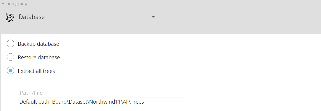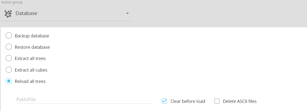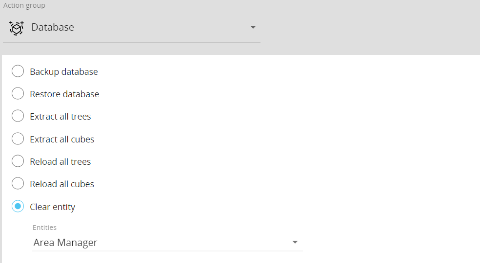 The Database Actions allow you to mainly perform maintenance activities on Data models, such as backing up and restoring Data models, extracting and reloading Cubes, Entities, and Relationship trees, and much more.