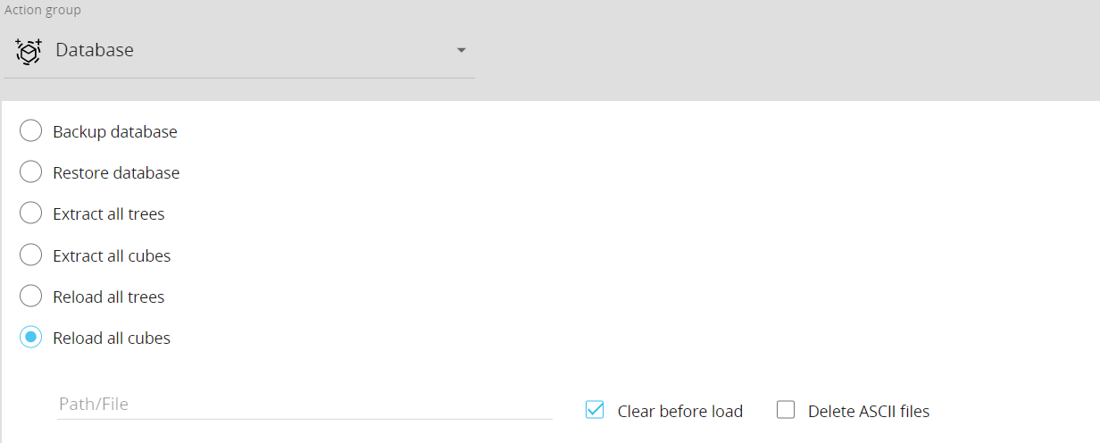 In addition, environment variables such as %bss% can also be used in the “Path/File” field. - Reload all Cubes. This step allows you to reload previously extracted Cube data in the Data model where the Procedure step resides.