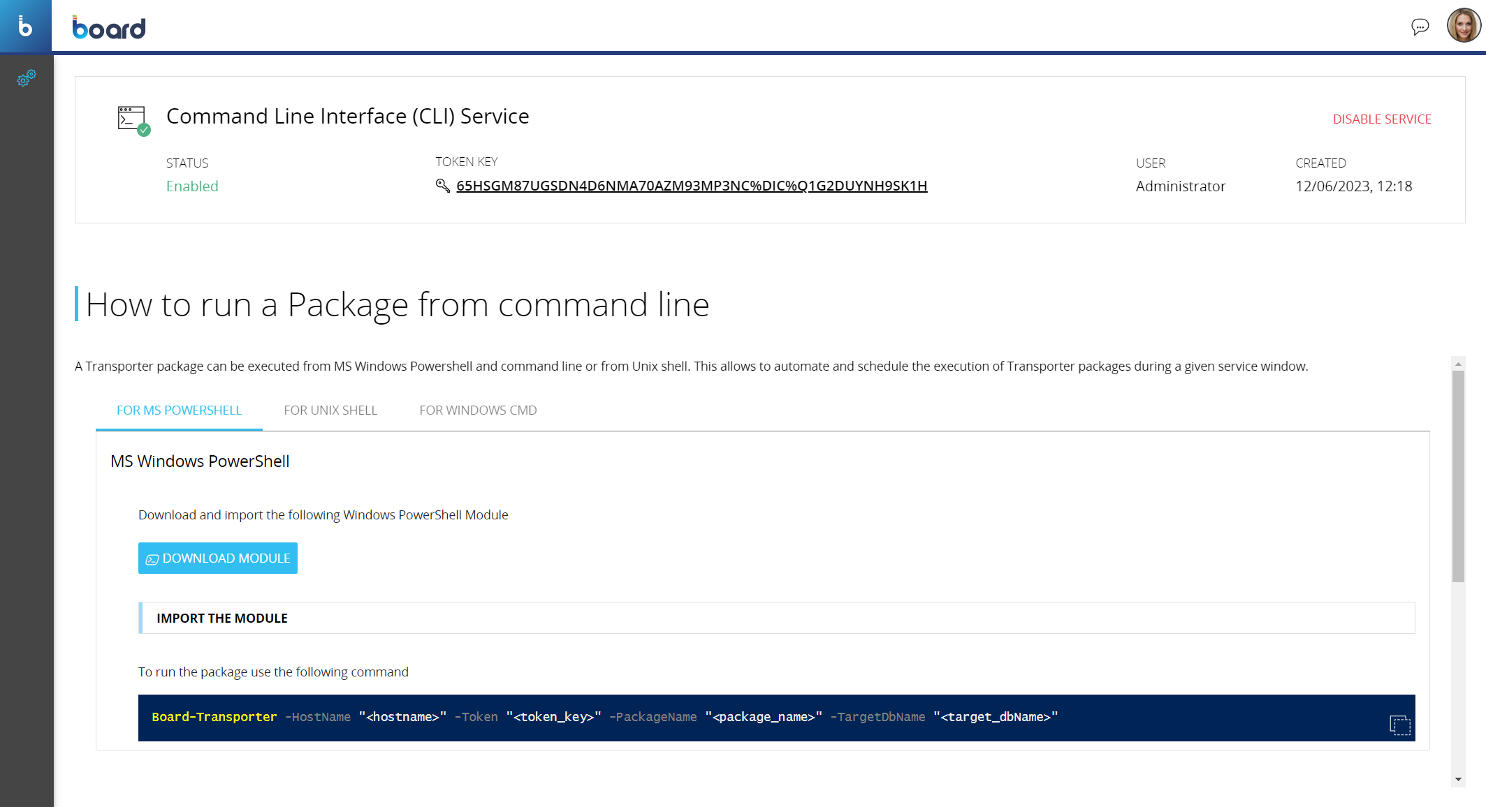 The CLI automation section allows you to enable the Command Line Interface (CLI) Service and gives you all the necessary information and tools to create an automated and scheduled Transporter package execution via CLI.