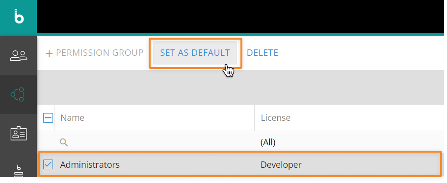 To set a Permission Group as default, select it in the table and click the "SET AS DEFAULT" button that appears on top of the table: