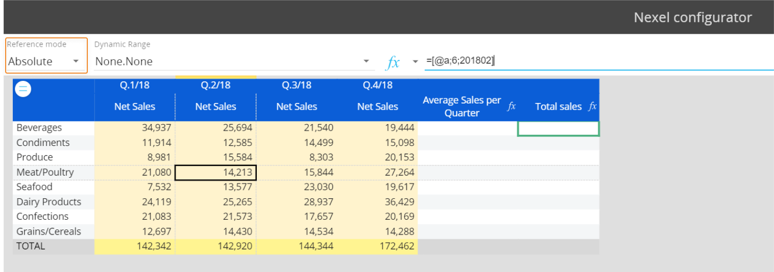 The cell in the formula is identified by the coordinates [@a;6;201802] where "@a" is the Block identifier, "6" is the code for the member "Meat/Poultry" (Entity set by row), and "201802" is the code for Q.2/2018 (Time Entity set by column). - Relative. The cell is identified by its shift from the position of the cell that contains the formula.