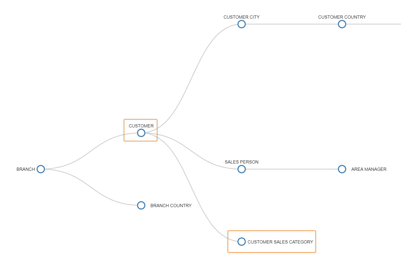 The following tree shows the Relationship between the Customer Sales Category Entity and the Customer Entity: