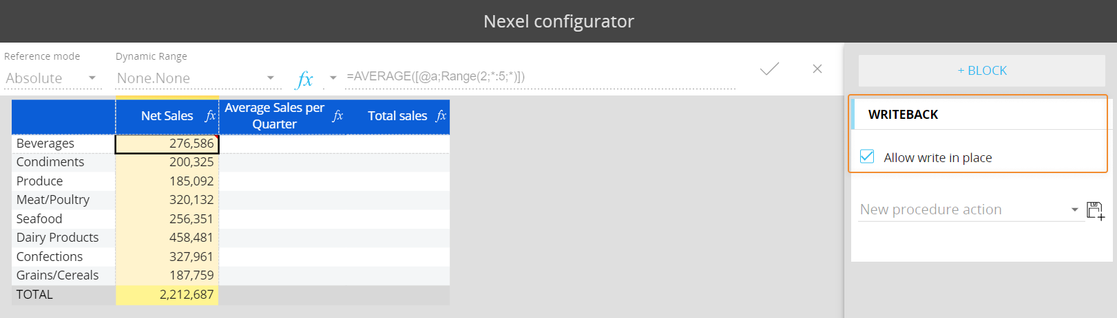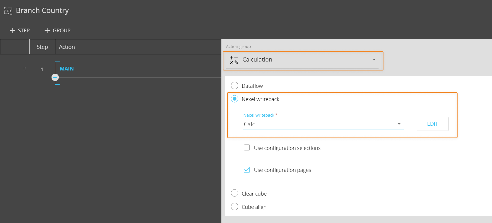 The new Action is available under "Nexel writeback" in the Calculation actions group in the Procedure configuration page (Procedure designer).