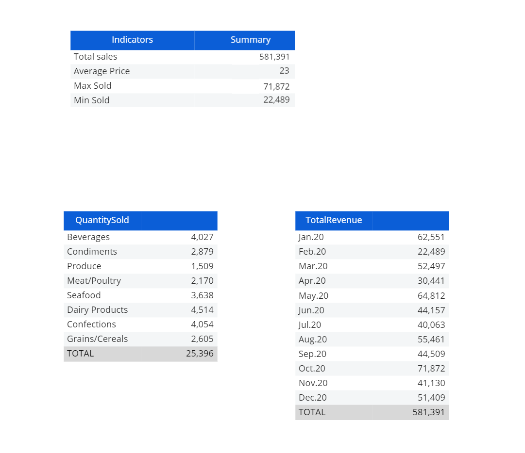 As you can see, we took the total value of the two Data Views to calculate the Average price, while we used the TotalRevenue Data View to calculate the other indicators with various formulas (MAX, MIN, SUM).