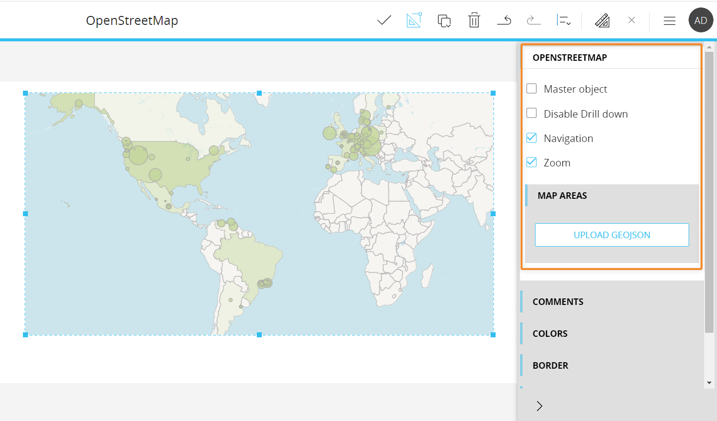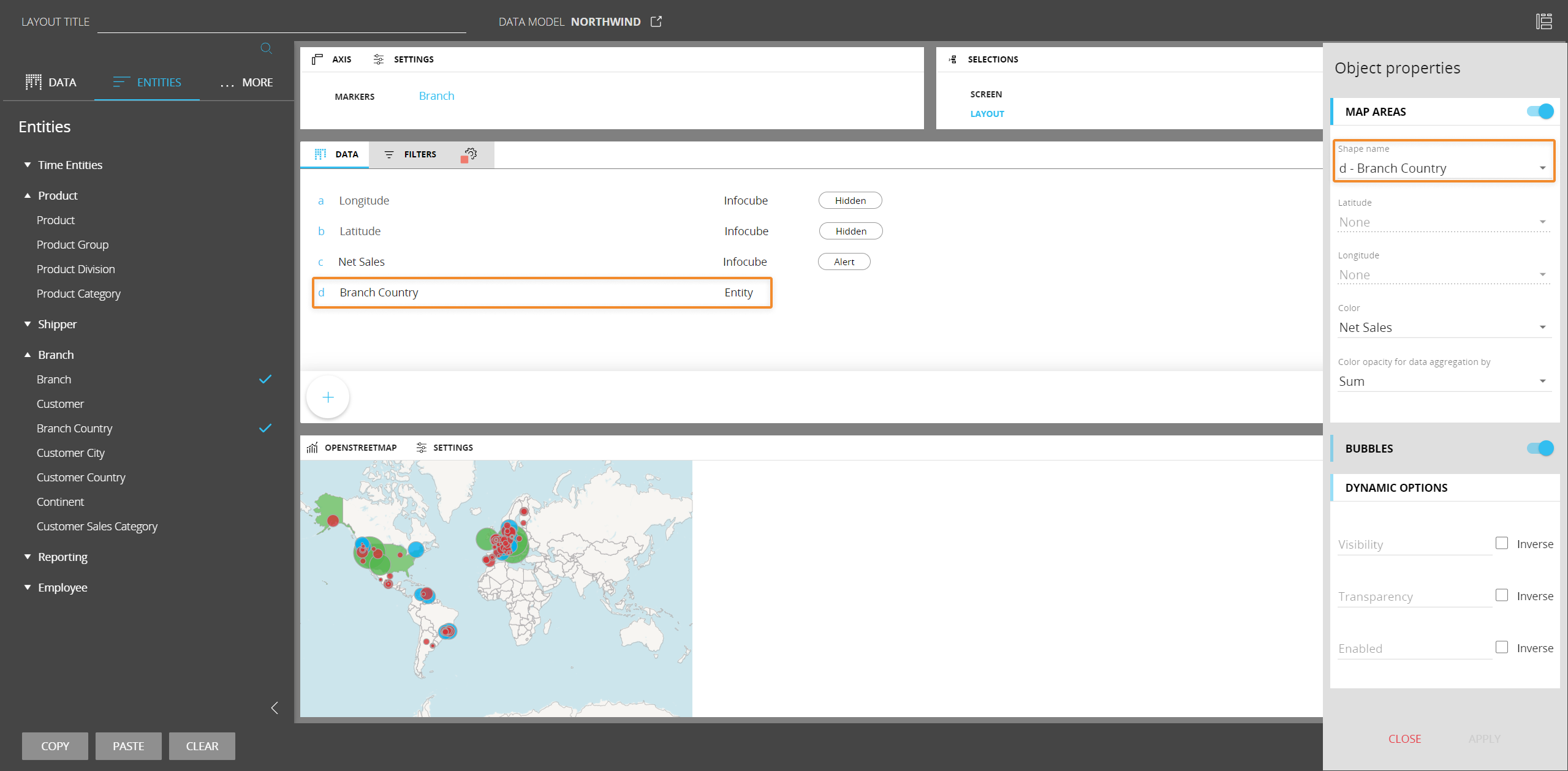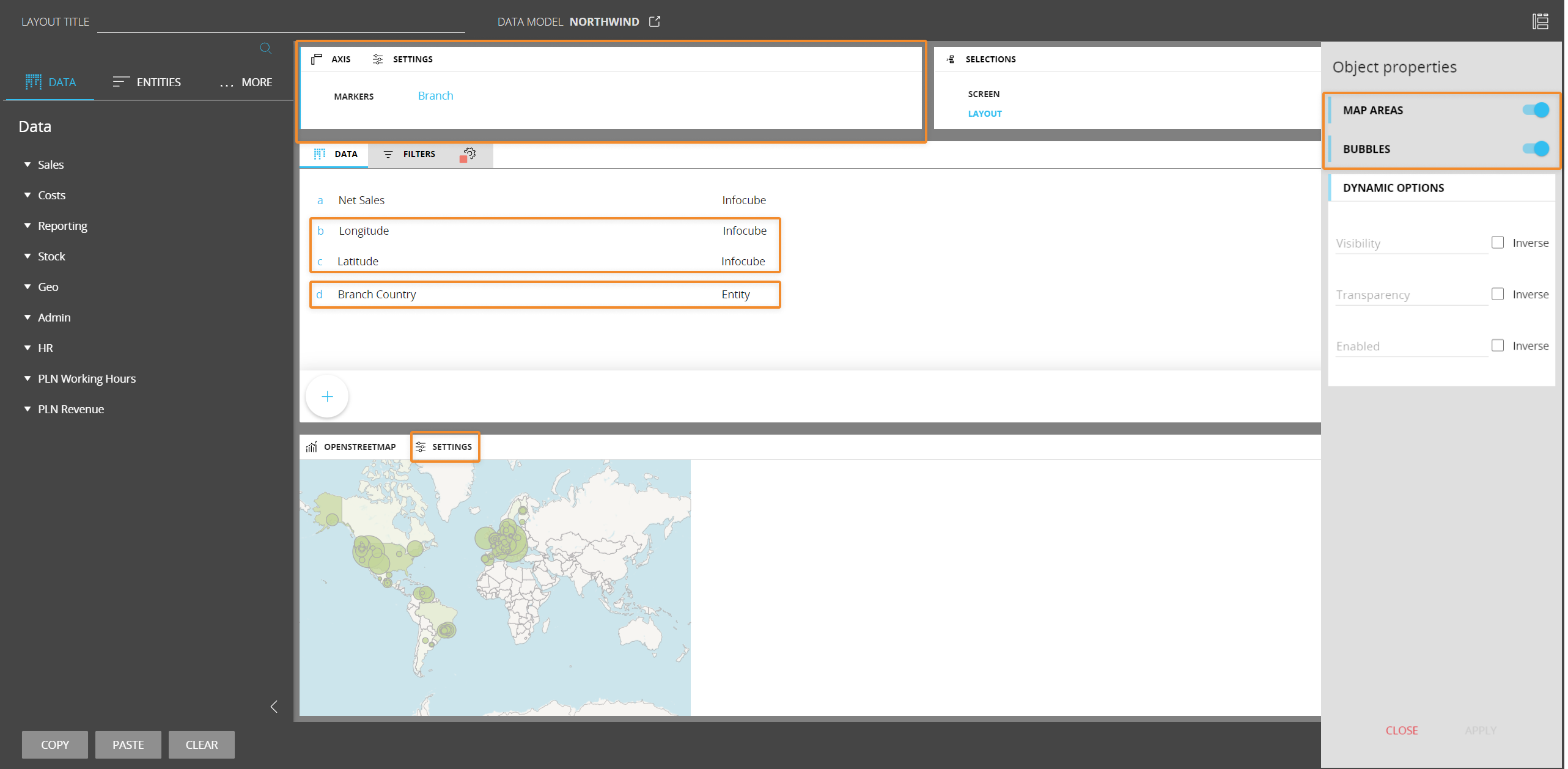 The following Layout definition will then visualize your data on the map, provided you have configured Bubbles and Map Areas in the Object Properties panel (see next paragraph for more info):