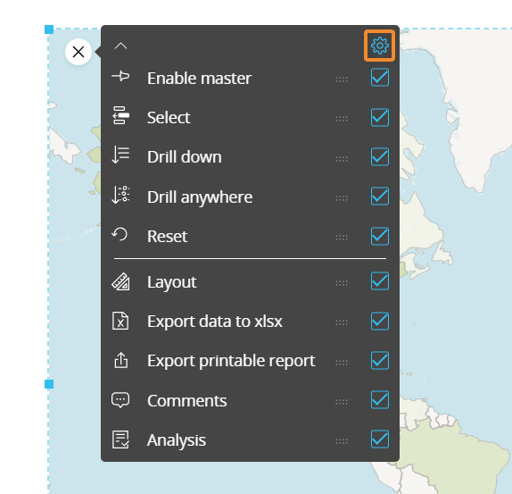 You can also configure which options will be available in the contextual menu (sliding toolbar) in Play mode. To do so, hover over the map and click the contextual menu icon (
