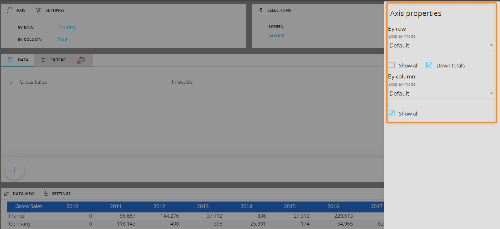 In the Axis area of the Layout Editor you can configure the aggregation level of the Layout query by selecting Entities to be displayed by row and/or by column. These Entities, in turn, define how Cubes in Data Blocks are dimensioned by in the associated Screen Object.