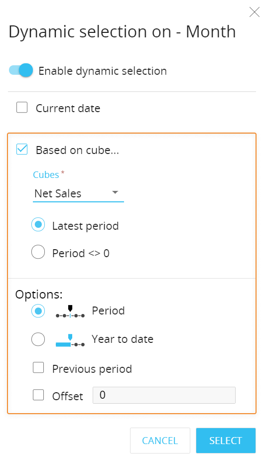 For example, if you're configuring the selection on the Month Entity based on a Cube whose latest data pertain to July 2021, the June-2021 member will be selected. - Offset. Shifts the selection by "n" periods, where "n" is an integer number.