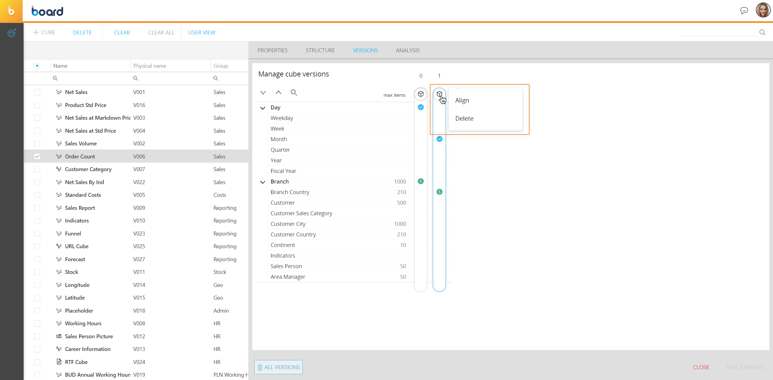 To verify and align versions of a Cube, click on the "VERSION" menu to reveal the list of all existing versions.