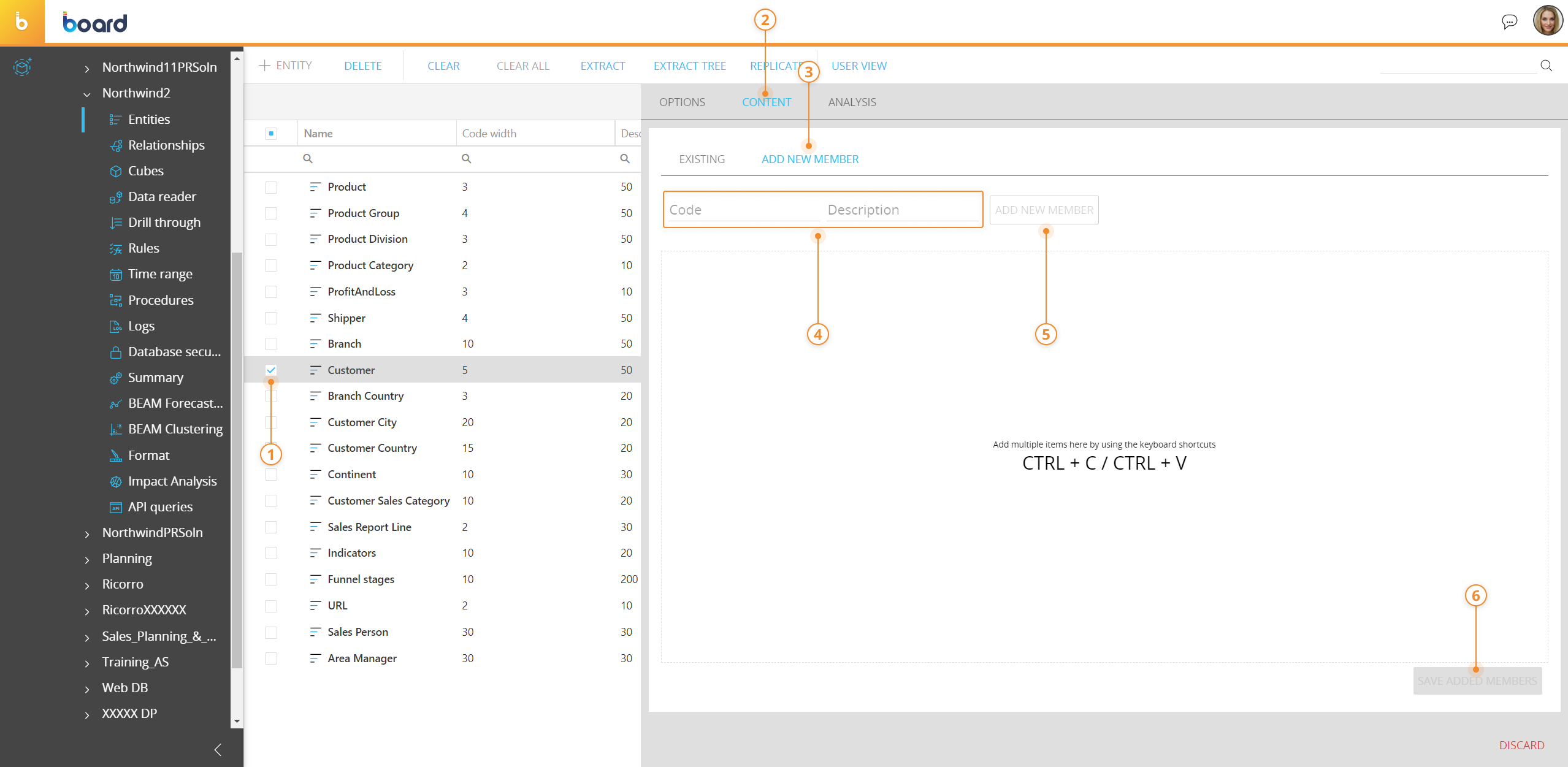 - Manually, from the "CONTENT" tab. This process is useful for adding single members to an Entity or for populating small Entities which do not exist in your source data systems.