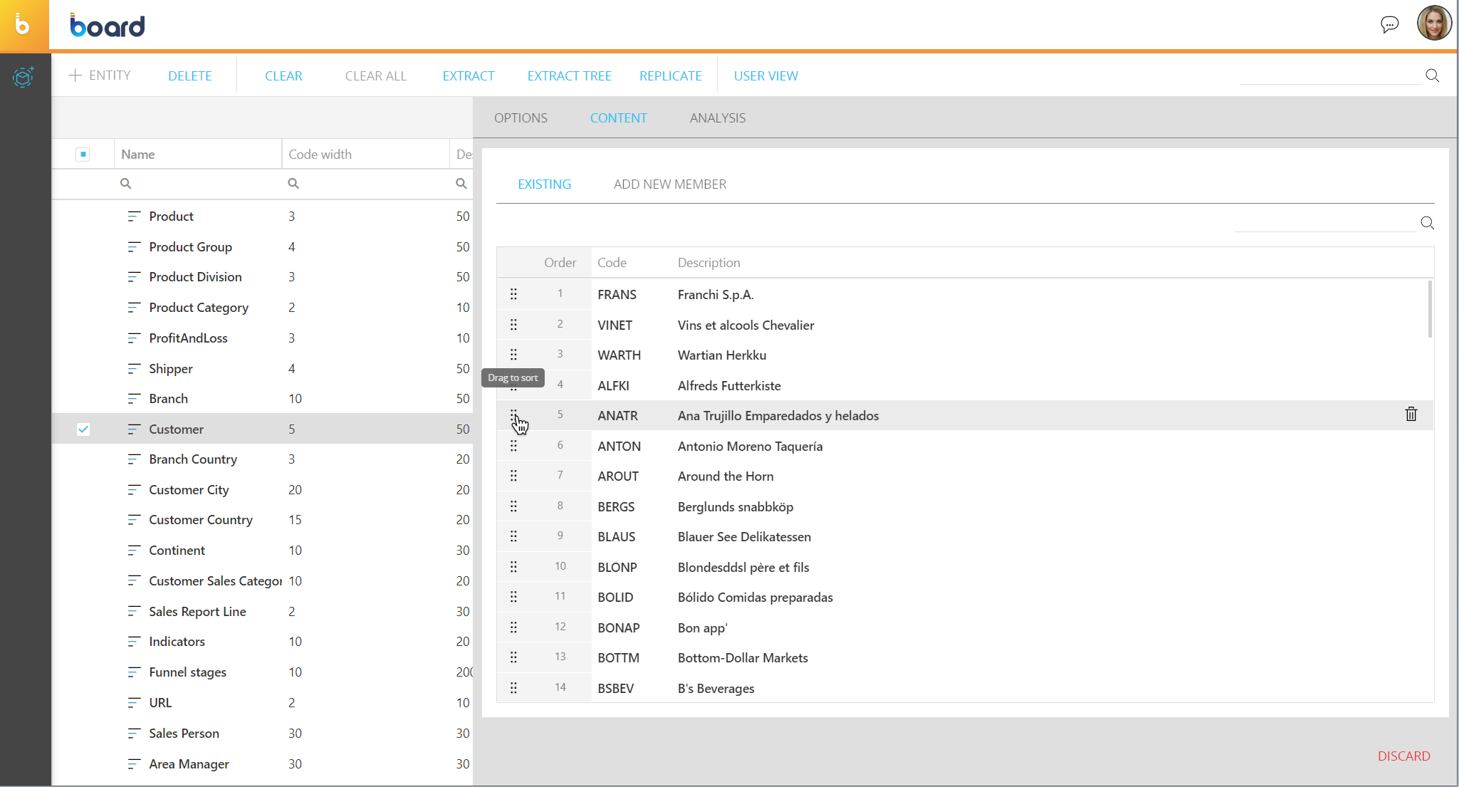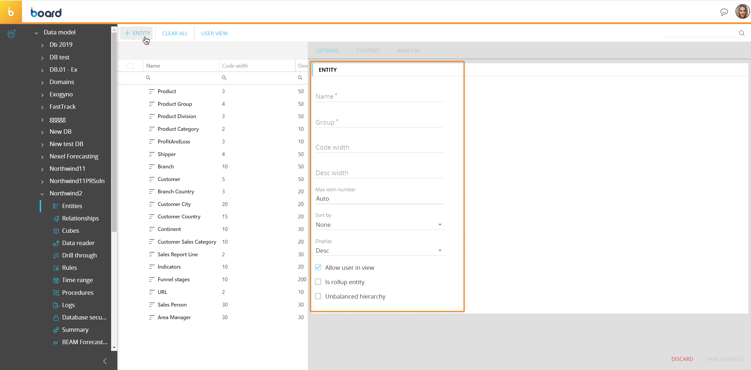 You must also bear in mind the Code and Description widths that are set for the Entity, as well as the Max item number, as these parameters cannot be exceeded. If any of the parameters are exceeded, no new members will be added until the incorrect members are removed. - Via a Data reader. The Data reader is a Board tool which allows you to import data from text files, ODBC, OLE DB- or OLAP connections into the Board database. After mapping the source data to an Entity, running the Data reader will load members into it following the saved configuration. This method is the most common and appropriate for populating large Entities. See Data reader basic concepts for more details