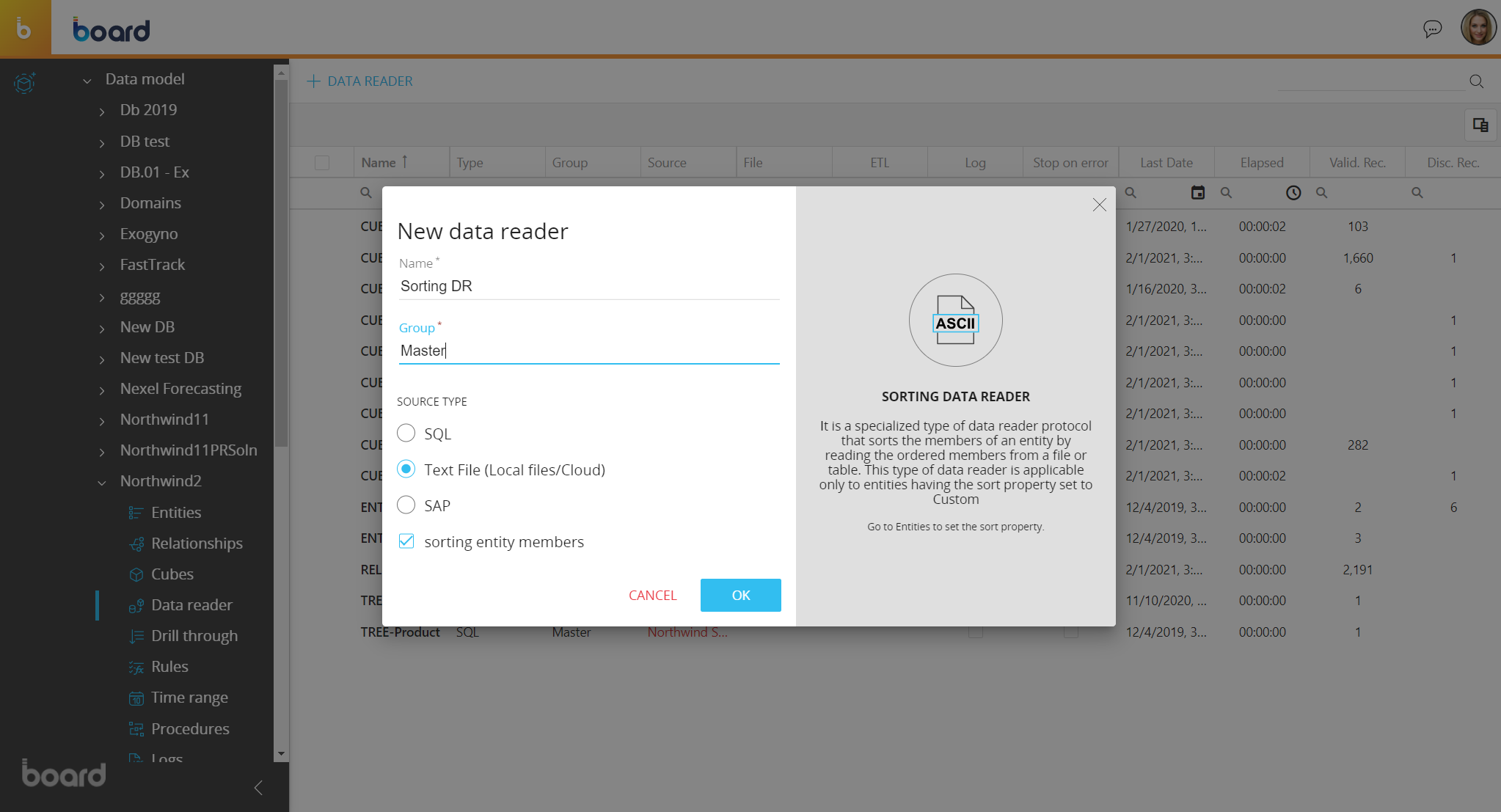 - Using a Data reader. When at least one Entity sort option is set as "Custom", then a "Sorting entity members" checkbox will appear when creating new Data readers: once the option is enabled, only the Entity fields can be used in the Data reader as it will only be able to set the order of members. The order in the file/query read by the Data reader will be used in the custom sort. All members not read by the sorting Data reader are placed at the end of the member list following the order in which they were originally created. New members added (manually or via the Data reader) to a custom sorted Entity are also placed at the end of the member list, in order of creation.