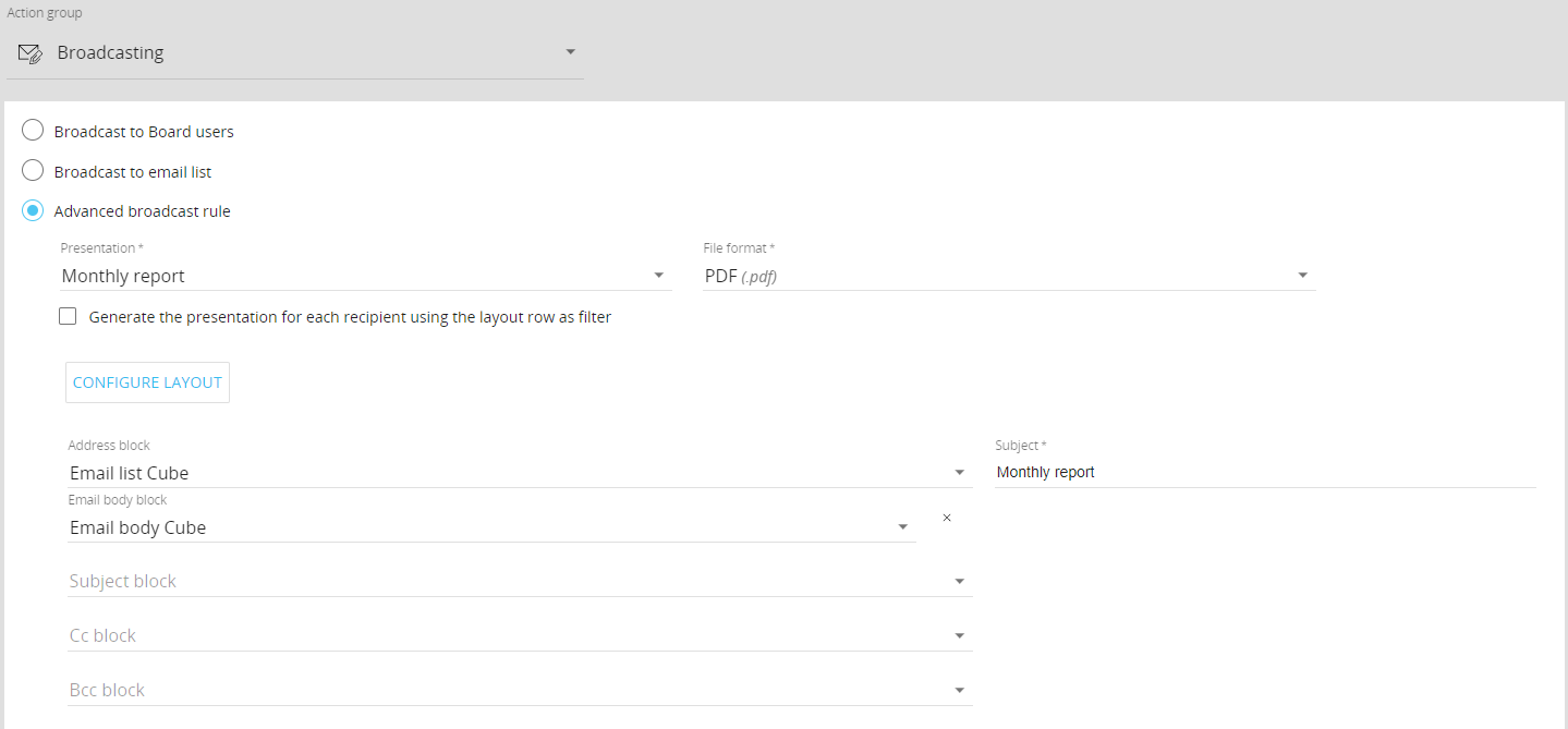 Advanced broadcast rule. This step allows you to send emails using a Board Layout to extract all information to compose the email message: email addresses, message bodies, and email subjects will be retrieved from the Data Blocks configured in the associated Layout.