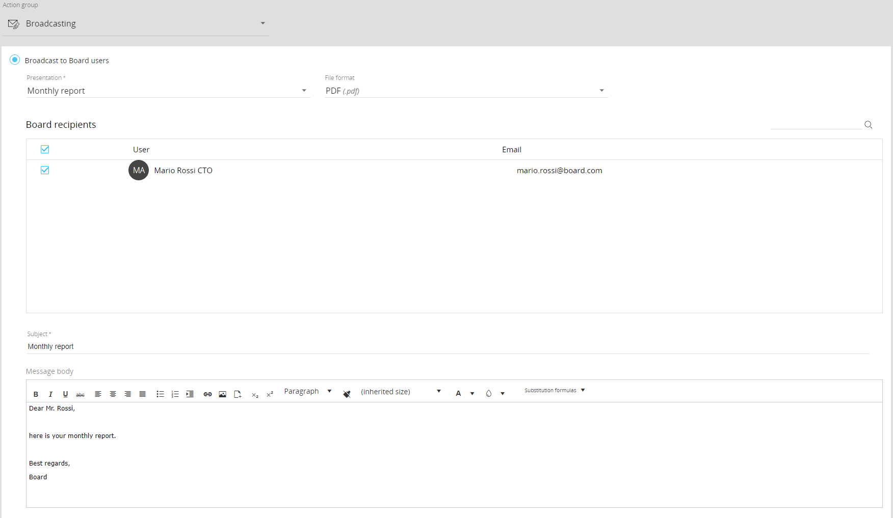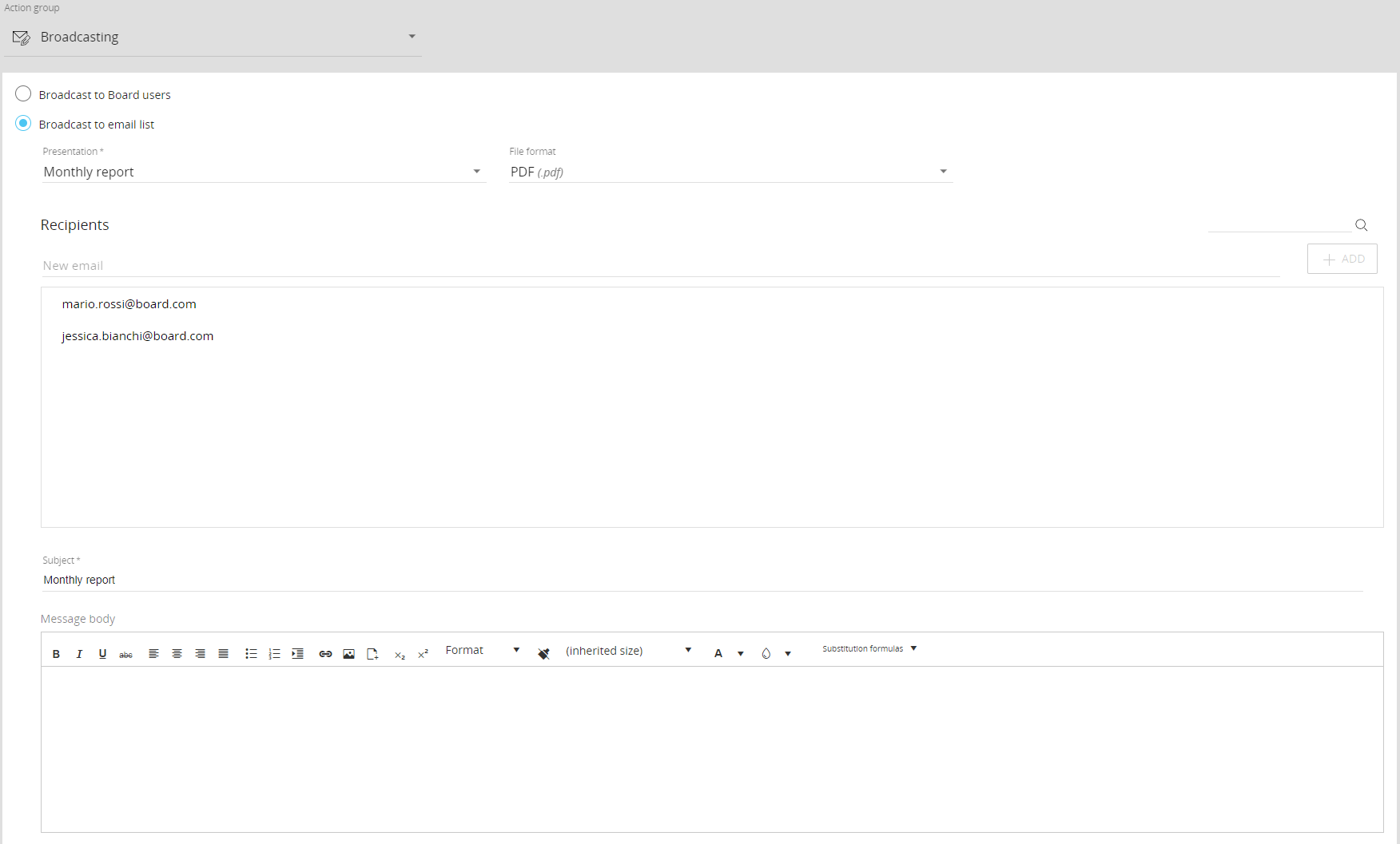 The Broadcasting Actions allow you to send Presentations via email to a specified list of recipients, in different file formats. The Presentations can also be exported to specific paths within your Board environment.