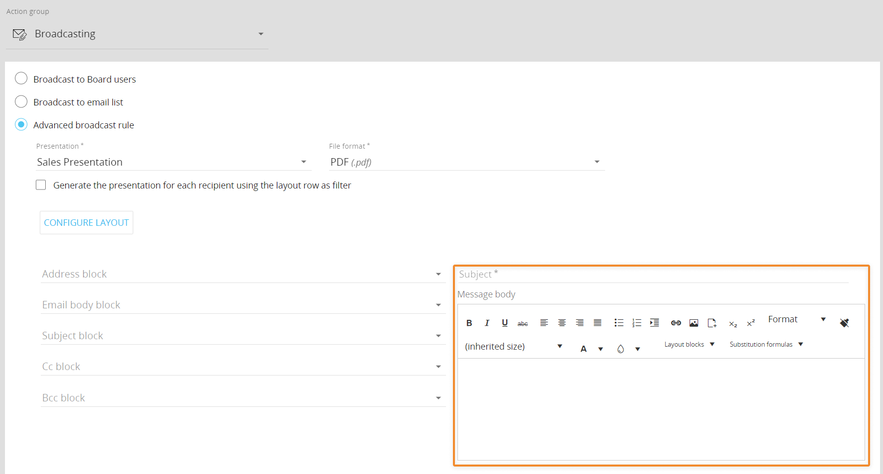 For the three steps described above, Board Substitution formulas and Layout Blocks can also be included in the message body (provided a Layout has been configured in the "Advanced broadcast rule" step or in the "Export presentation to file" step). You can either choose them from the “Layout blocks” and “Substitution formulas” menus on the top right of the message body field or you can manually enter them into the message body.