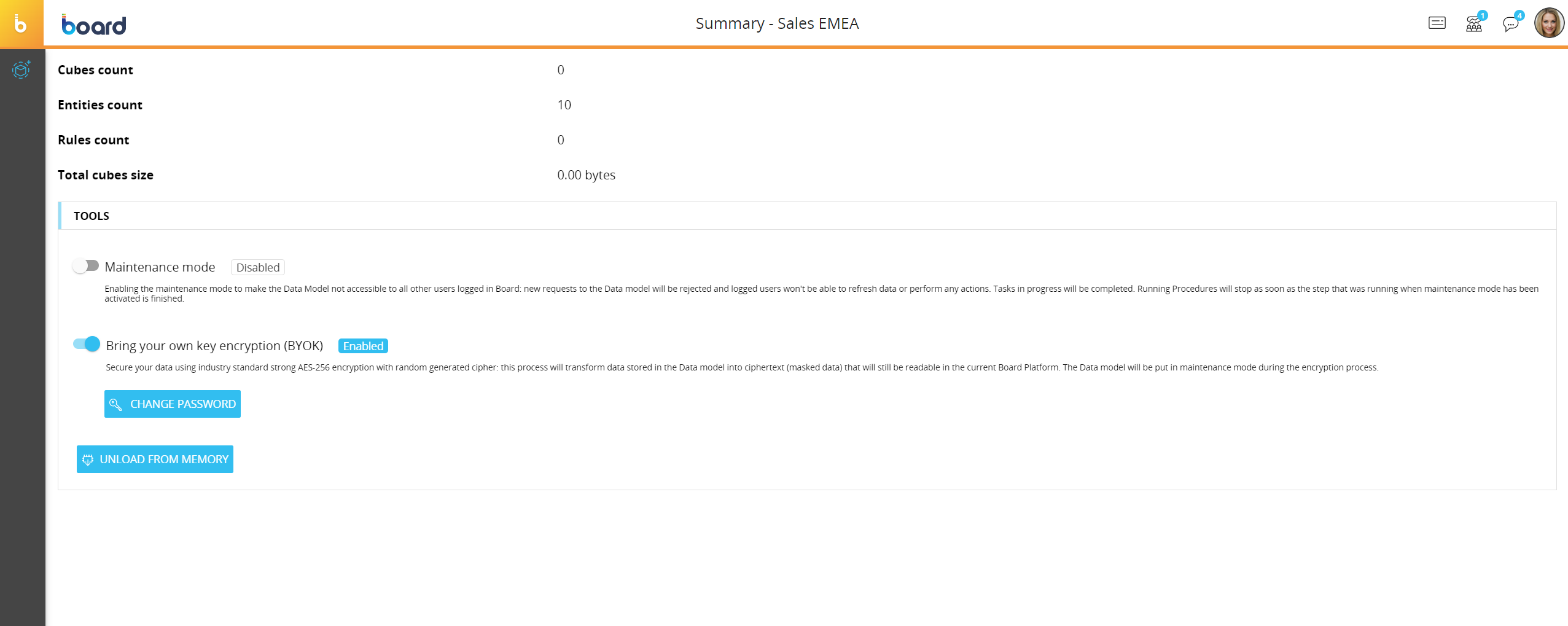 In Board, data is always encrypted and keys are managed automatically without the need for customer intervention. With the Bring your own key encryption (BYOK) feature, Developers can autonomously manage data encryption within Board in a quick and easy way, preventing potential malicious uses and security/confidentiality breaches. This feature provides enhanced security for data using industry standard strong AES-256 encryption with a random generated cipher, making it unreadable outside of the current Board Platform unless and until it is decrypted. Encrypted content includes Entity members and data stored in Cubes.