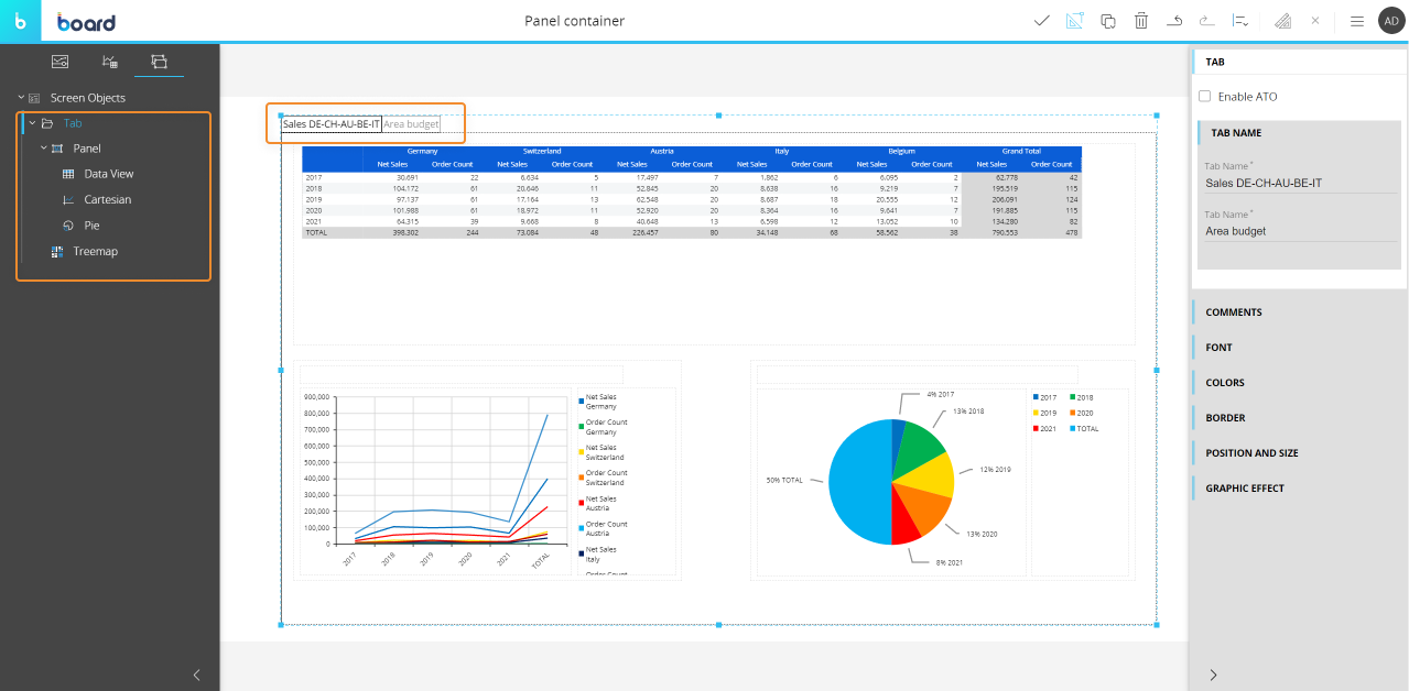 As you can see from the Screen Objects order in the left panel, the Panel containers has been added to a Tab container, creating a flexible configuration capable of showing multiple Objects in a single tab.