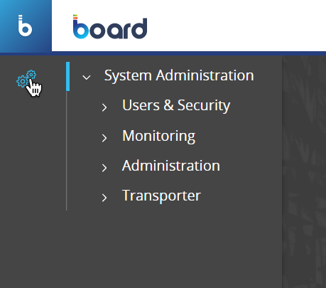Board's Main Menu appears when the mouse pointer hovers over the light blue square at the top left corner of the page. From the menu you can quickly jump to one of the other sections of Board, access your Favorites Capsules page, access your recently opened Capsules or perform a search on the entire Platform.