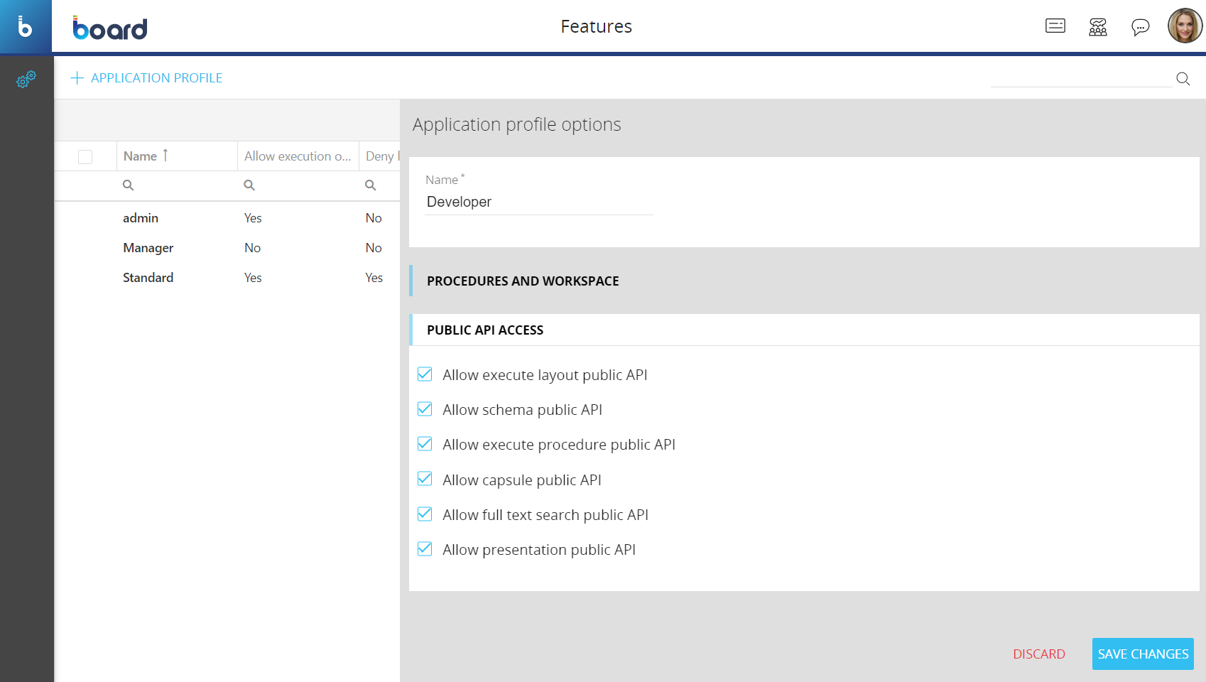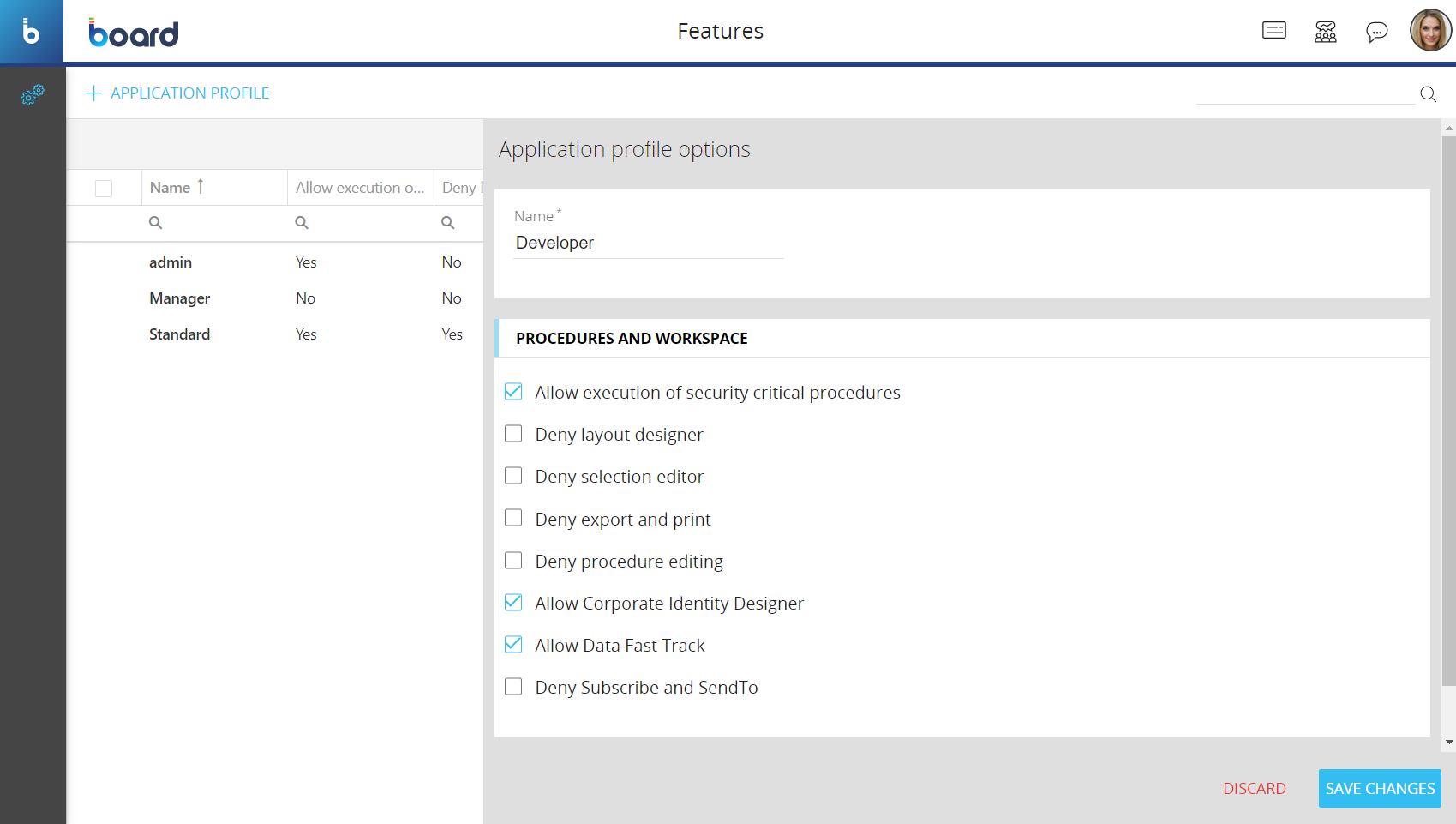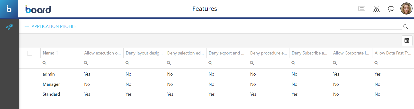 In the Features section, you can manage Application Profiles which allow or deny user access to various Board features, such as editing Layouts, editing Procedures, performing selections, and much more. You can apply these Application Profiles by associating them with a user Role in the Roles section of the System Administration area, then you will have to associate a Role with each user in the Subscription Hub.