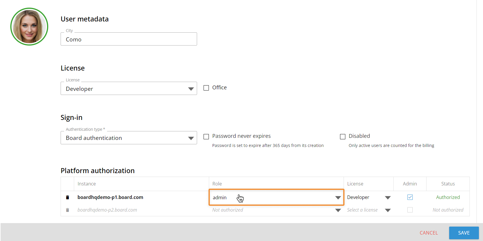 - Choose the Role in the drop-down list under the "Role" column of the "Platform authorization" table