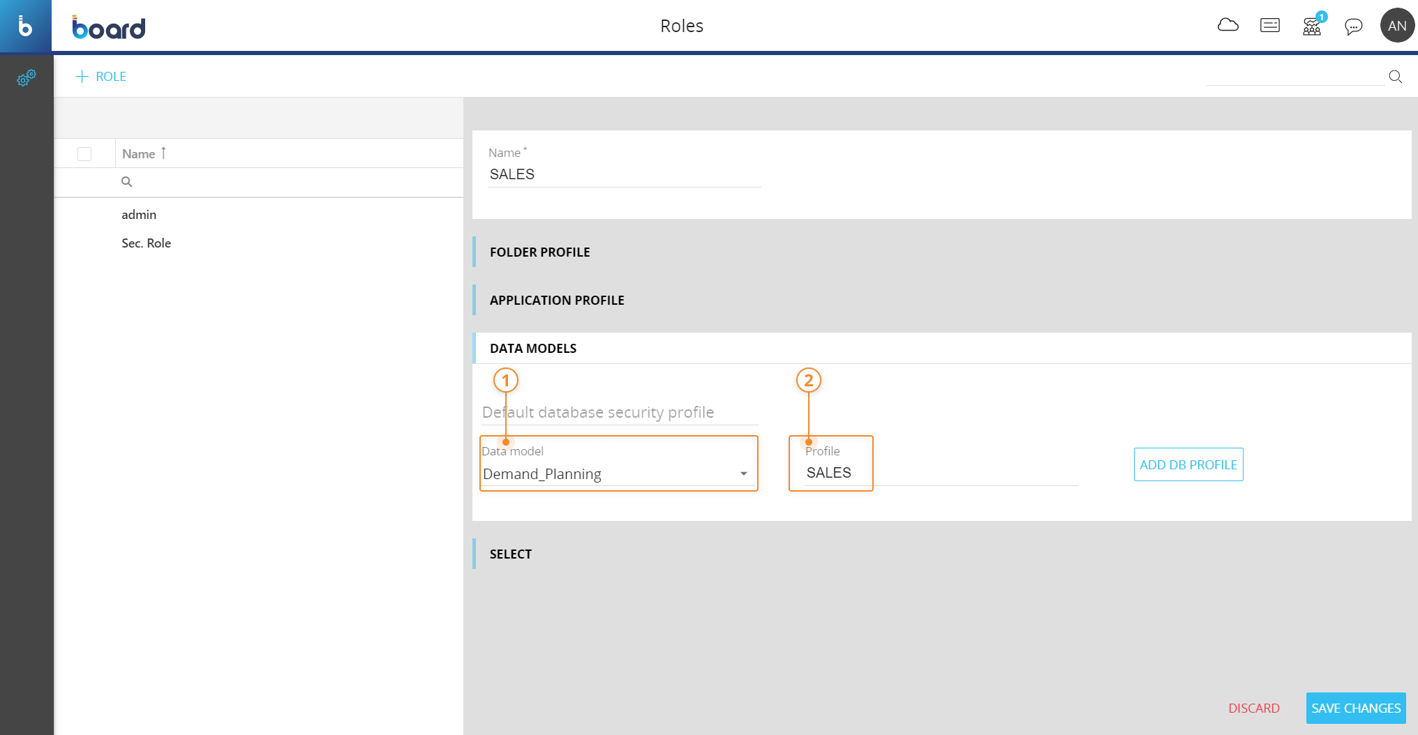 その後、データモデルのセキュリティプロファイルを、同じBoardプラットフォームのロールに関連付ける必要があります。 方法は次のとおりです。