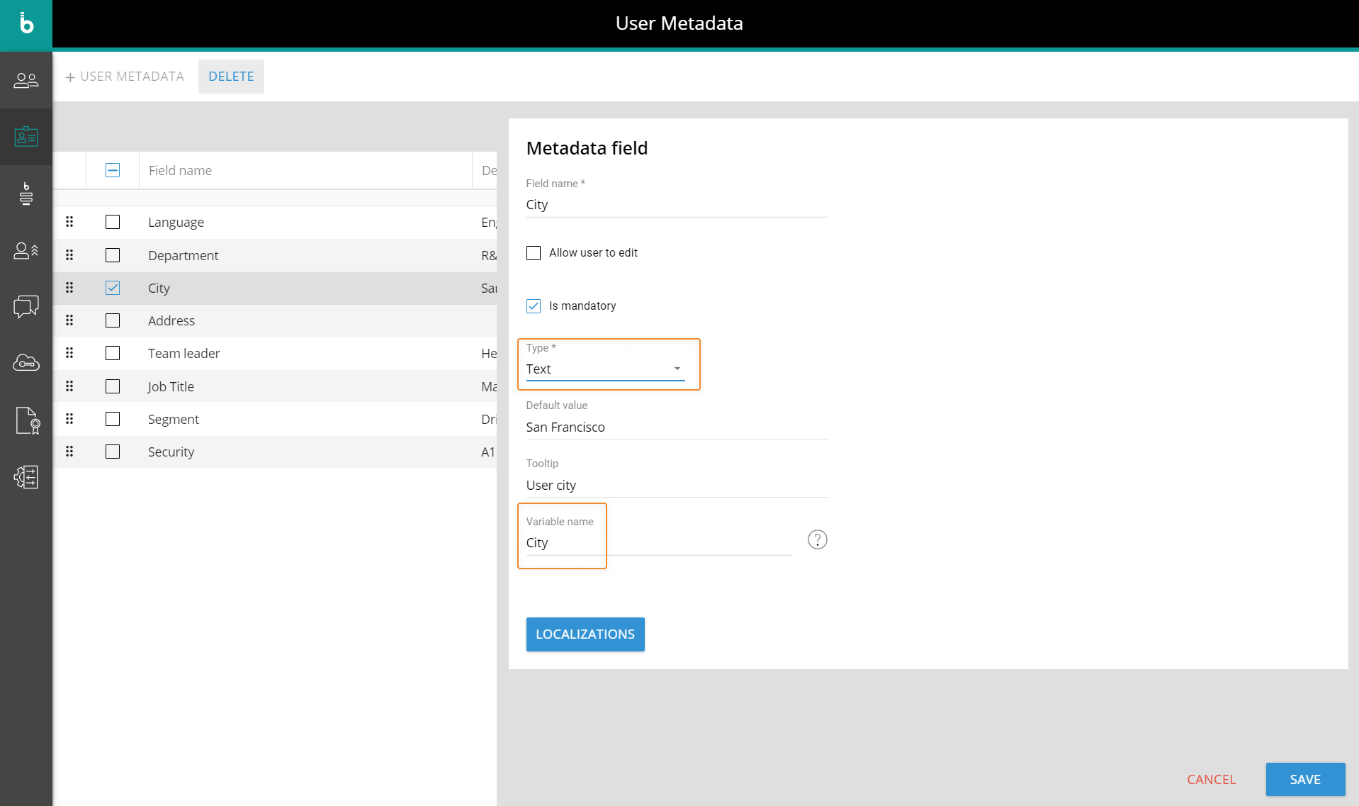 どちらのユーザーメタデータフィールドタイプでも、青色の[ローカリゼーション(LOCALIZATION)]ボタンを押すと、他の言語バージョンのフィールド名を入力することが可能で、これは、Boardプラットフォームに設定されているユーザーの言語設定に応じて表示されます。