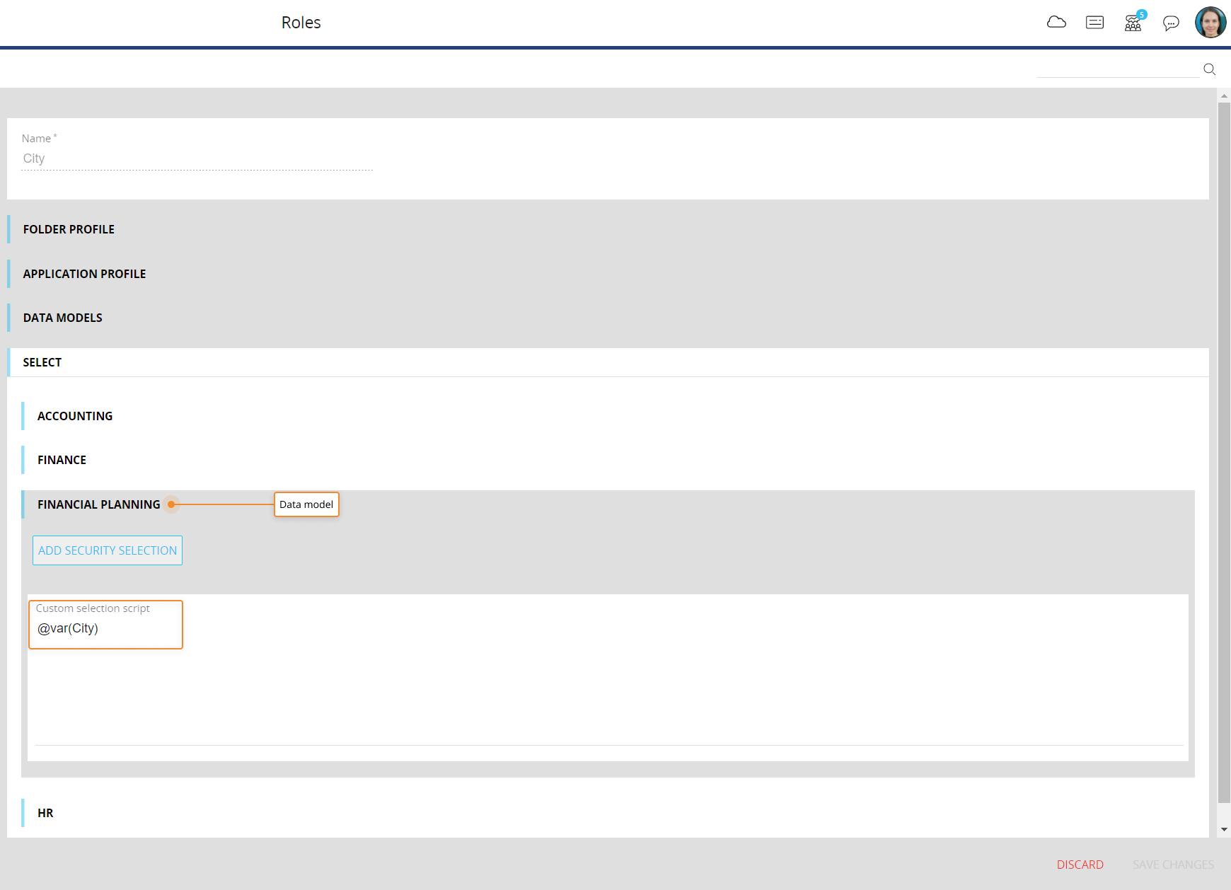 これを行うには、セキュリティプロファイルを編集または作成し、[データ選択(Data selection)]で@var関数を使用してカスタム選択スクリプトを割り当てます。 したがって、選択設定はデータモデルレベルで適用されます。