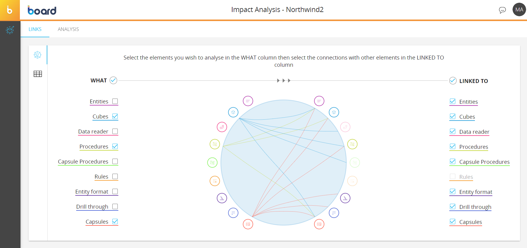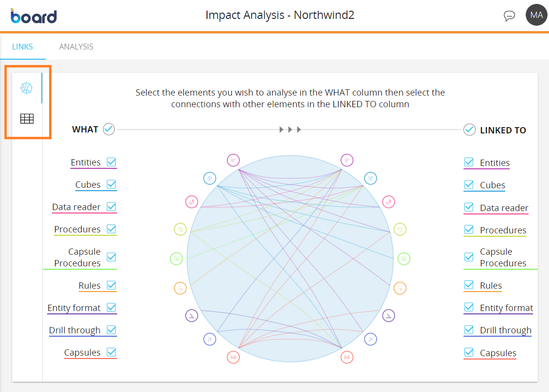 In this area, the Data model elements are displayed both on the left and on the right of the diagram, under the “WHAT” column and the “LINKED TO” column respectively. These elements are arranged radially along the circle, with the connection between them drawn as arcs connecting them inside the circle area. Each element is underlined by a specific colored line, which is reflected in the icon color and in the line that connects the selected elements.