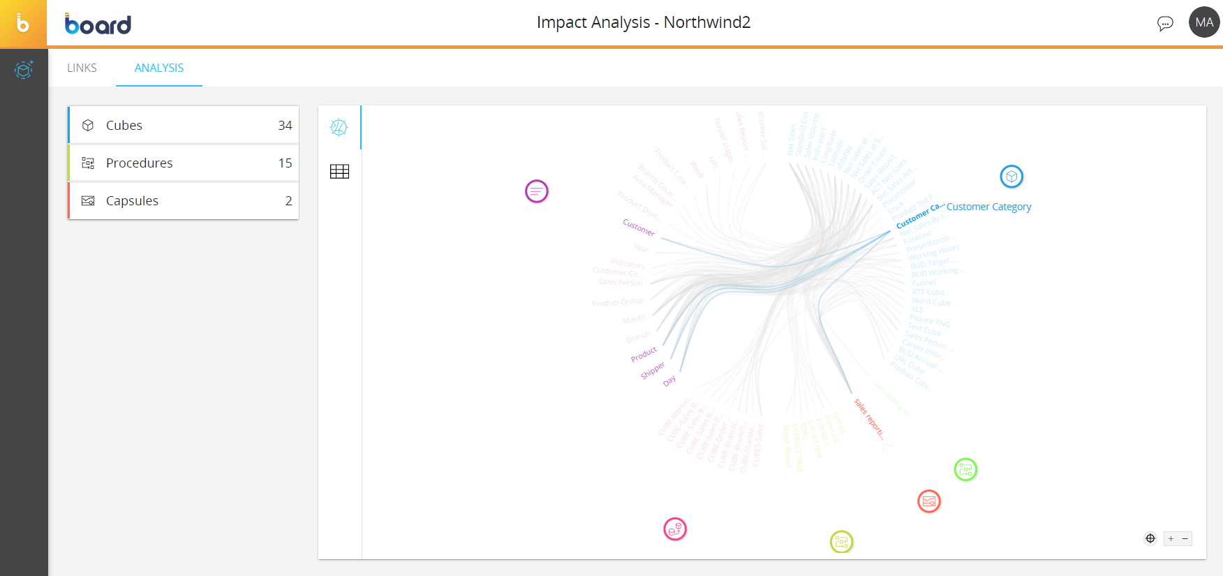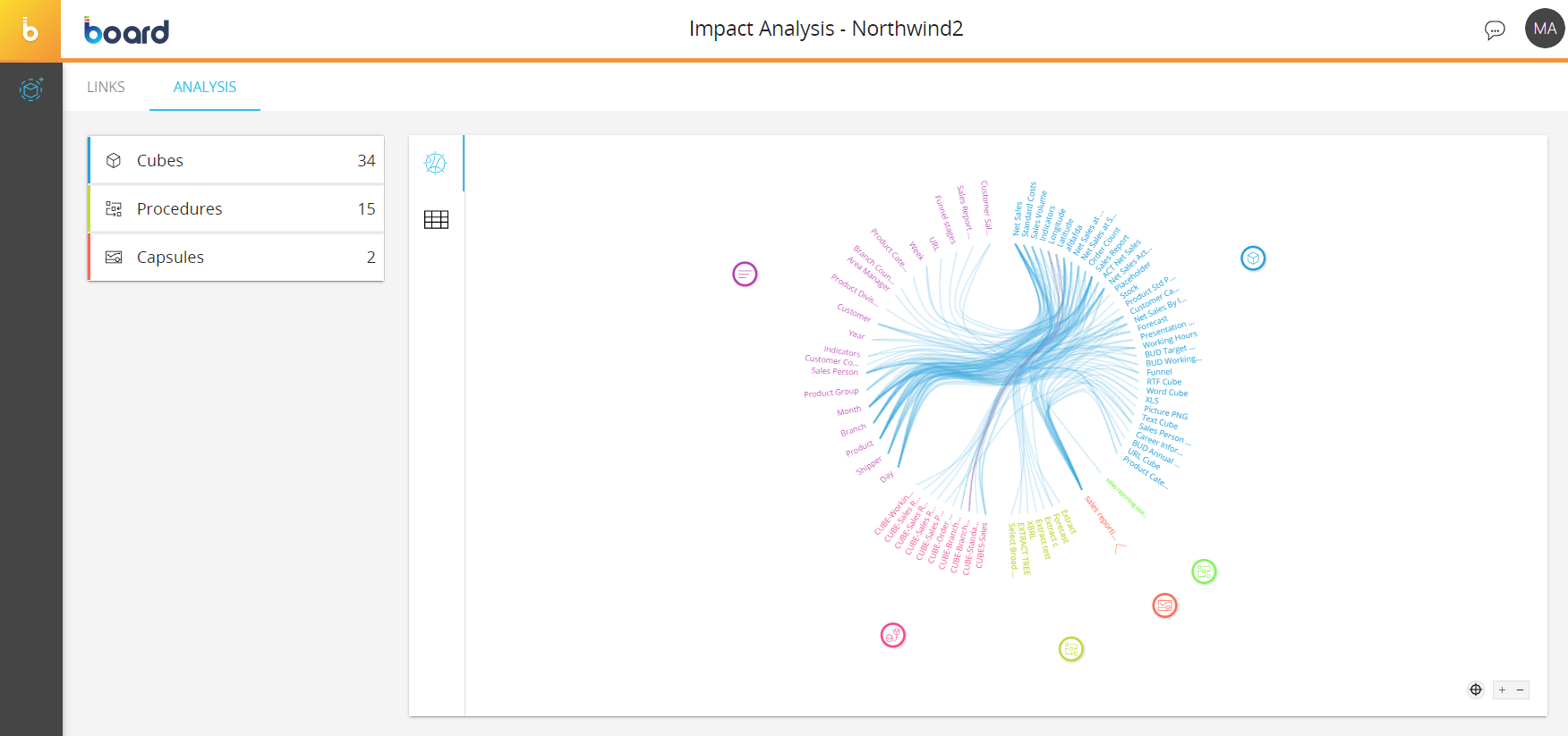 This page is displayed by default when you access the Impact Analysis area or when you click on the "LINKS" tab in the upper left corner. It displays a chord diagram of all the Data model elements and their connections to each other, which can be analyzed in detail in the ANALYSIS section explained in the next paragraph.