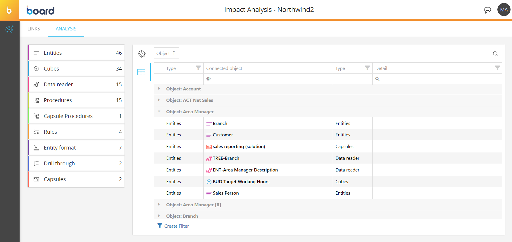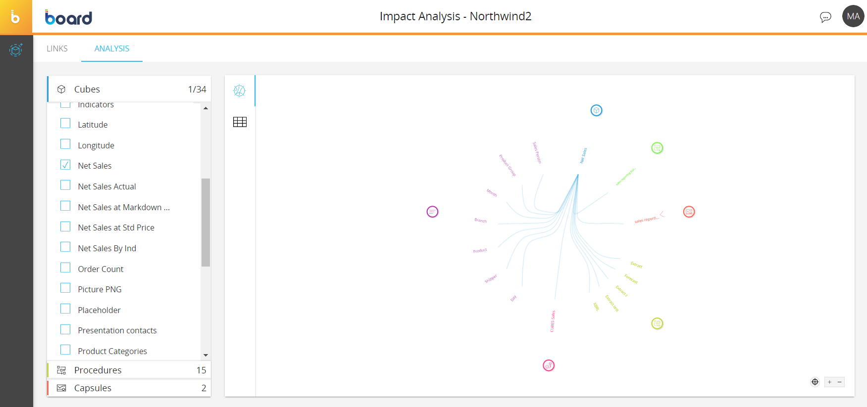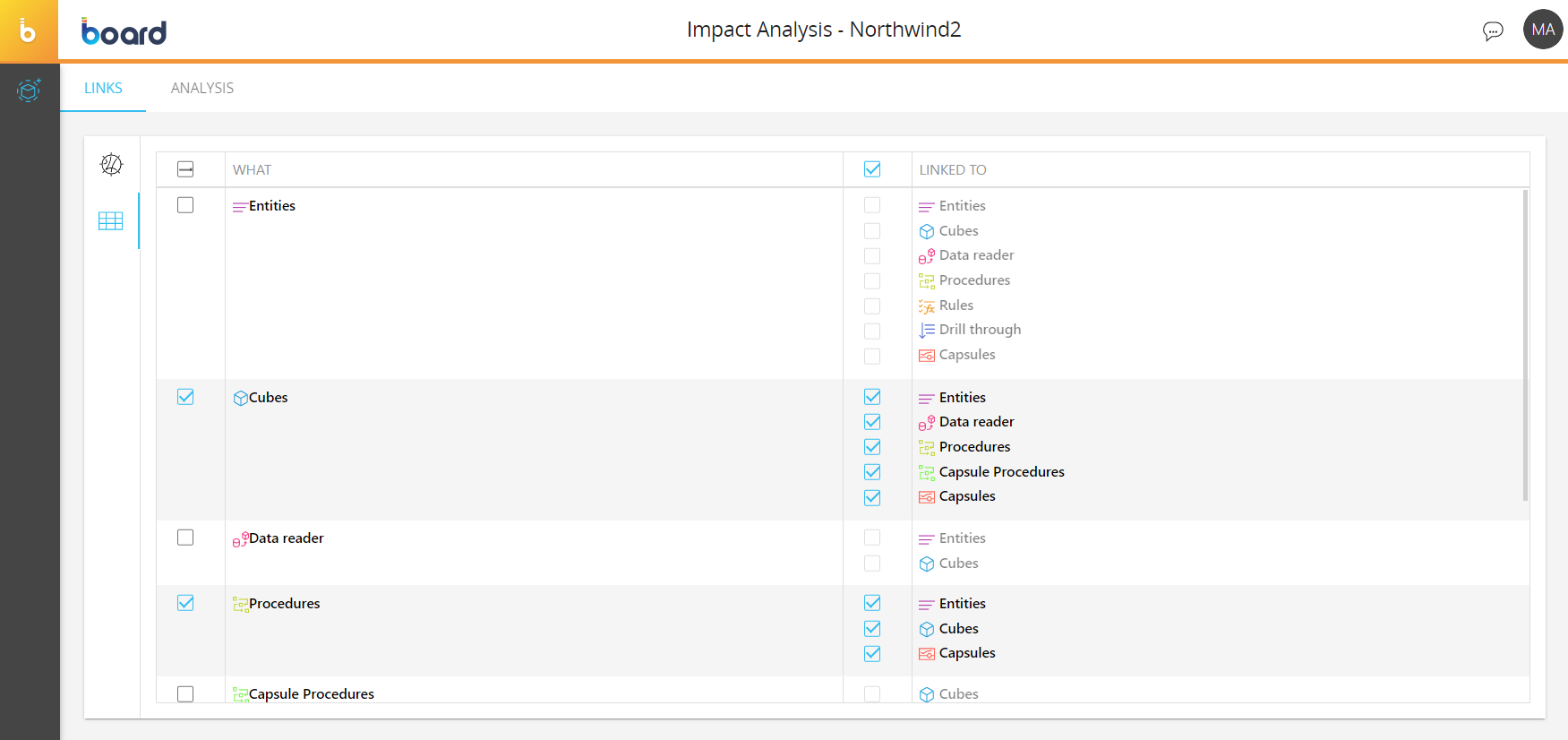 In this section, you can analyze the connections between all of the elements that are part of the Data model structure. This is very useful for analyzing the impact that a change to the Data model structure may have on all Board applications based on that Data model.