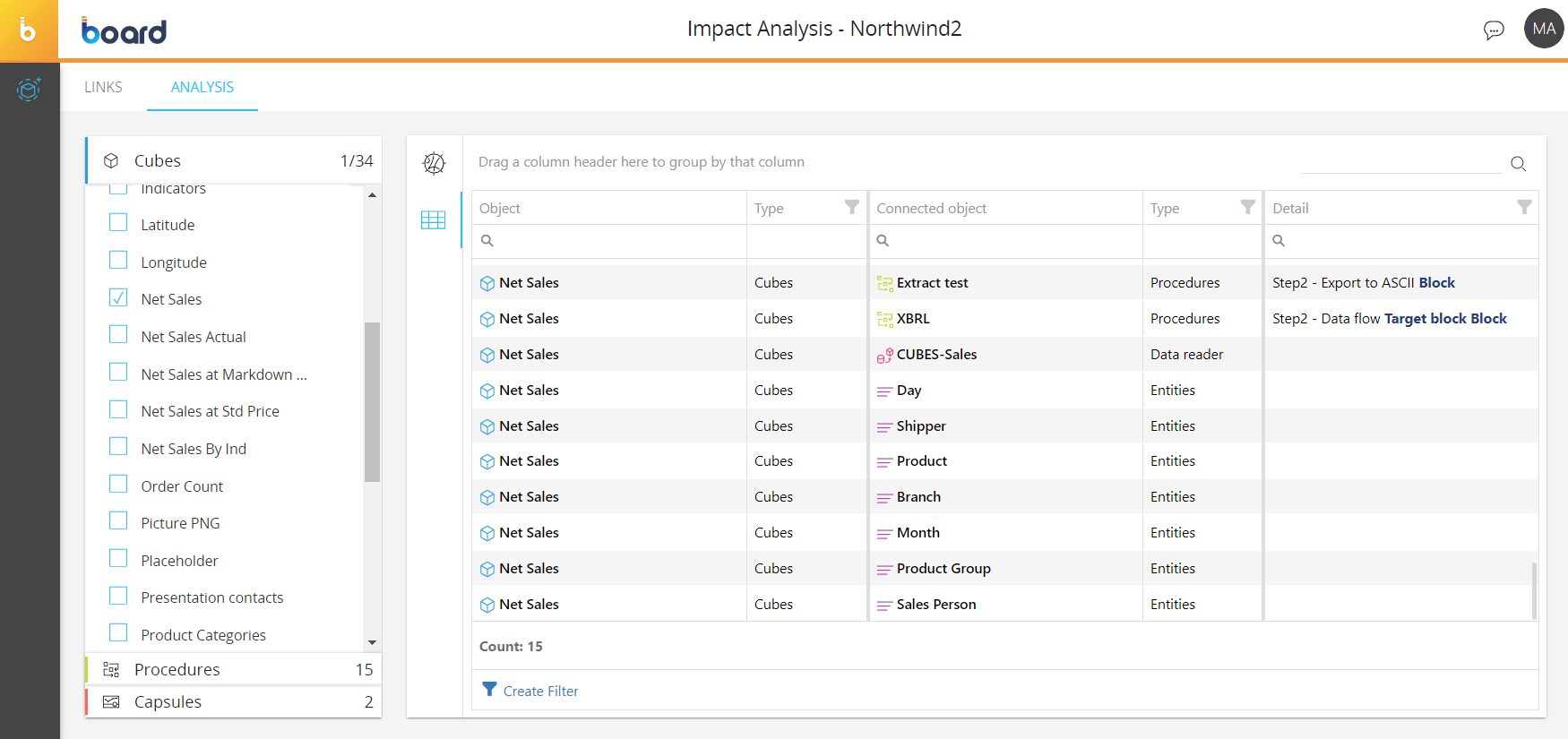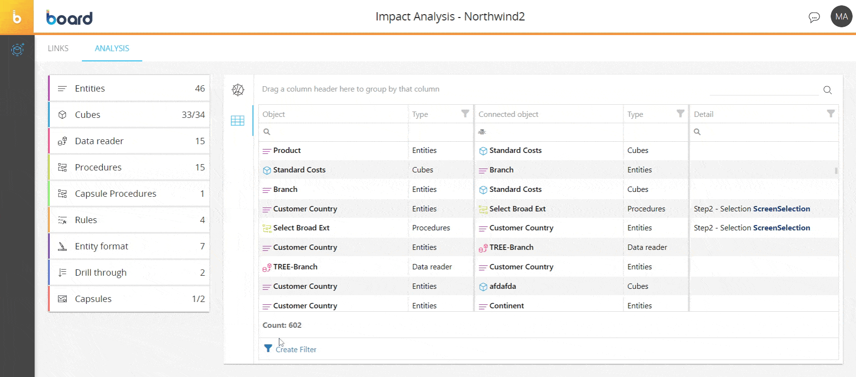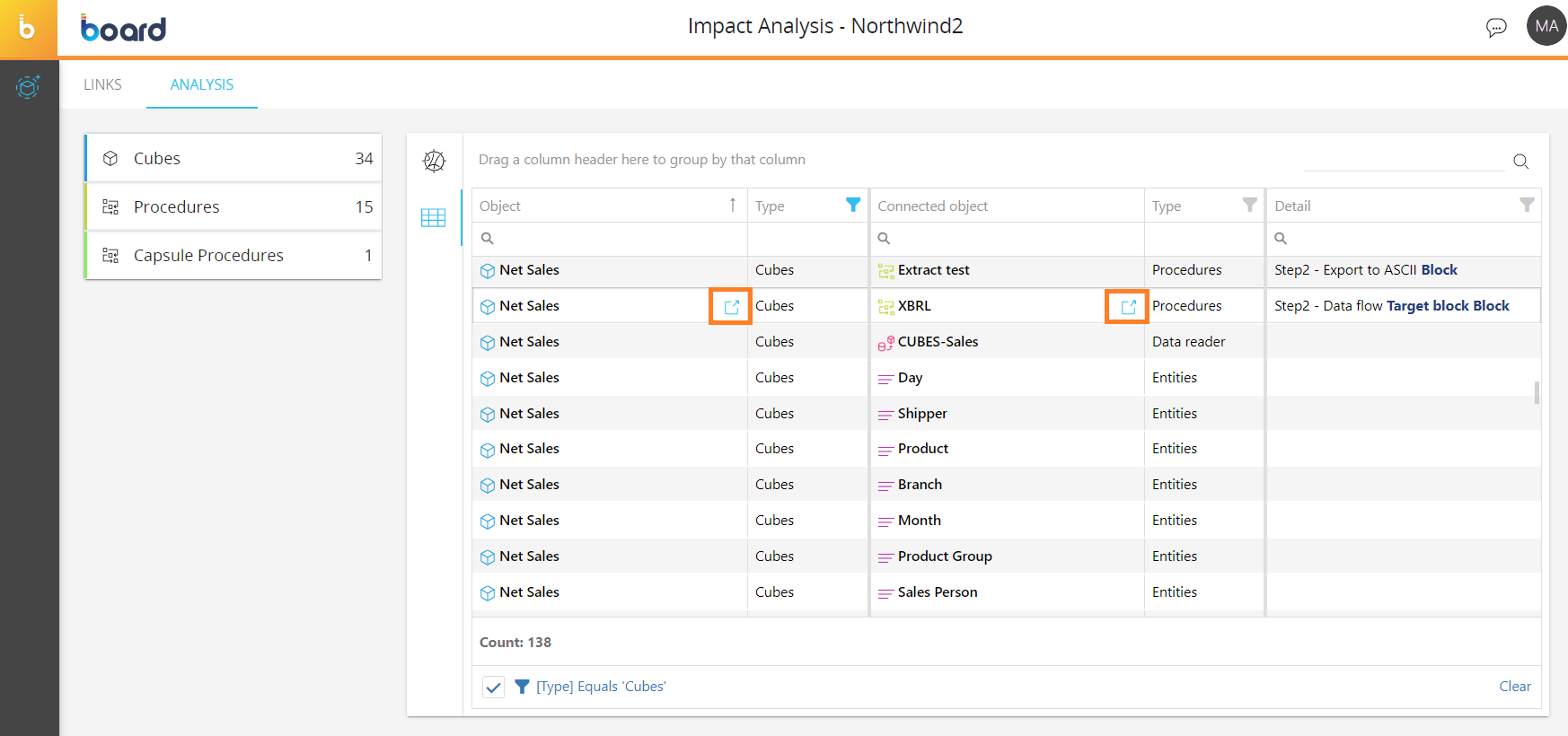 - Detail. This column displays additional details about the connection between two items. For example, In the case where a Cube is used in a Procedure, the exact number and name of the step in which the Cube is used will be displayed in this column.