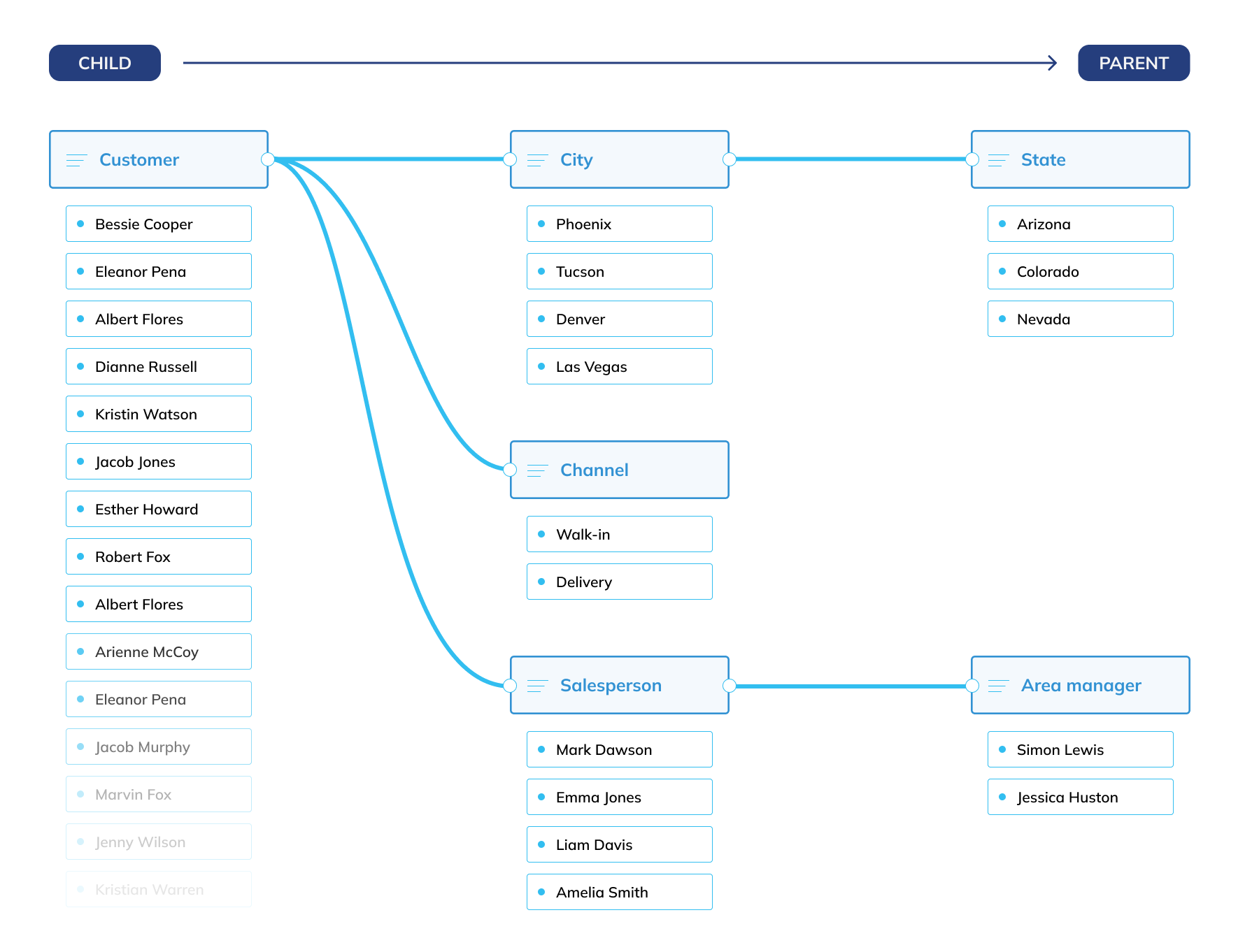 Sometimes the scenario is not so obvious. If we consider for example the Entities "Customer" and "Salesman", the definition of the hierarchical relationship Customer→Salesman implies that a customer can only be related to a single salesman. If this is always true within an organization, then it makes sense to define a Customer→Salesman relationship, but if a salesman manages multiple customers, then those two Entities should remain unrelated.