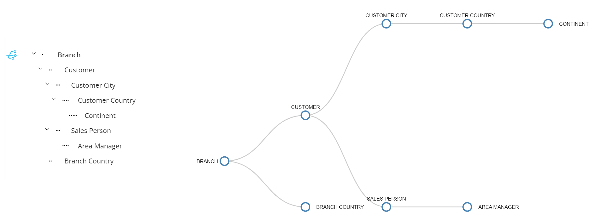 ) beside each Relationship tree. For example, the graphical view of the Branch hierarchy shown above is the following: