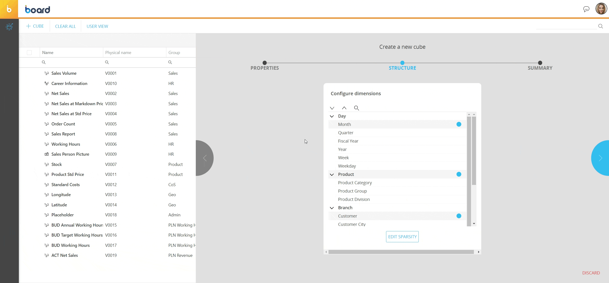 This is a key aspect, as it will affect how the data is stored and aggregated, as well as allowing for "drilling" into the data from a more aggregated view (at a lower level of detail) to a less aggregated view (at a higher level of detail).Selected Entities are automatically set as dense or sparse by the system. If needed, you can configure manually the sparsity by clicking on the "EDIT SPARSITY" button: once you're in the sparsity configuration page, click on the circle next to the selected Entities to cycle through the available configuration settings (green-sparse, blue-dense or deselected). You can also change the Cube structure, if needed.