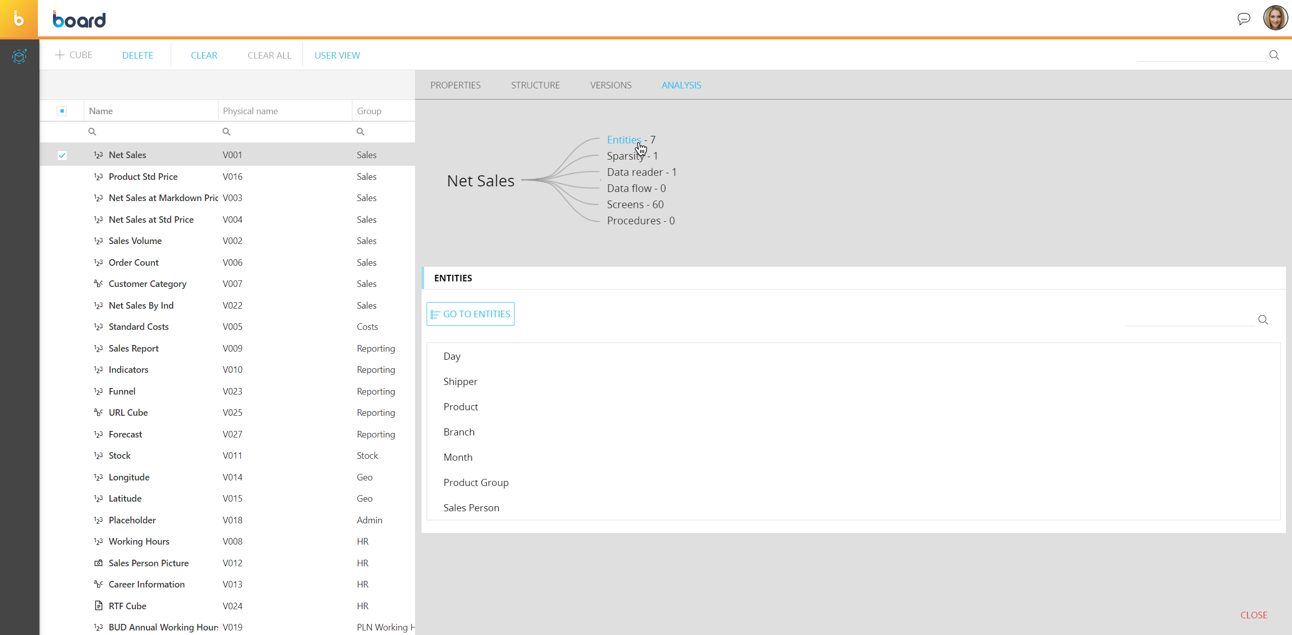 - Entities. Click on "Entities" to see which Entities are in use in the Cube structure and versions
